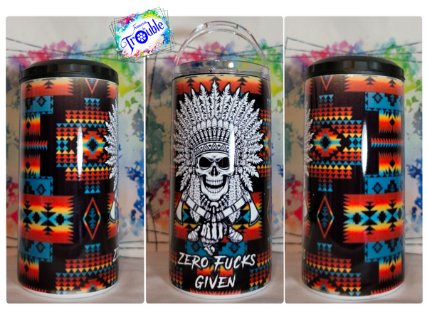 Dare to be bold with Chief Zero F*cks! This 4 in 1 tumbler/can cooler keeps your drinks at the perfect temperature for up to 6 hours. Bonus: it fits regular or skinny cans and glass bottles for versatile use. Take on your next adventure and never give a f*ck about warm or cold drinks again!