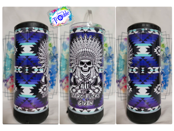 Take on every adventure with confidence and style with the Chief Zero F*cks Bluetooth Tumbler/Can Cooler! This 16 oz vacuum insulated steel tumbler comes with a lid and straw, keeping your drinks warm for 6 hours or cold for 12. Plus, the tapered interior fits regular or skinny cans and glass bottles, while the rechargeable Bluetooth speaker adds a soundtrack to your journey. Live life boldly and stay hydrated with Chief Zero F*cks!
