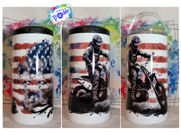 Conquer the trail with our Dirt Bike 4 in 1 Tumbler / Can Cooler! This 16 oz vacuum insulated steel tumbler keeps your drink at the perfect temperature for up to 12 hours. Plus, the included rubber can cooler top allows you to enjoy your favorite canned or bottled beverage without sacrificing insulation. Venture on, risk-taker!
