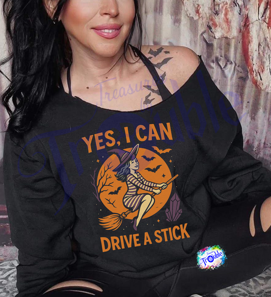 Add some attitude and fun to your wardrobe with our Yes, I can Drive a Stick Cotton Off Shoulder Sweatshirt! Made with soft, breathable Gildan cotton, it keeps you warm and comfy all day while making a statement with its high-quality DTF image. The cut out crewneck collar allows for a comfortable, wide neck fit. Express your unique style in this versatile and stylish sweatshirt!