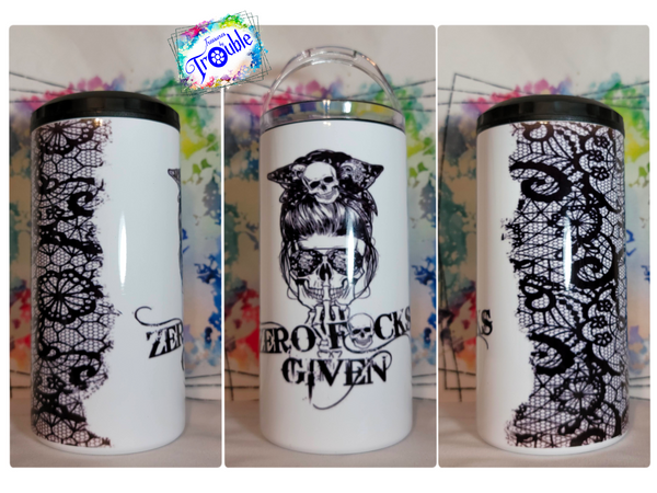 The Zero F*cks Given Lace 4 in 1 Tumbler/Can Cooler is the perfect versatile drinking vessel for the carefree individual! With 16 oz of vacuum insulated steel, this tumbler keeps your drinks warm for 6 hours or cold for 12 hours. Added bonus: a rubber can cooler top for regular or skinny cans and glass bottles. Stay cool (or warm) while giving zero f*cks!