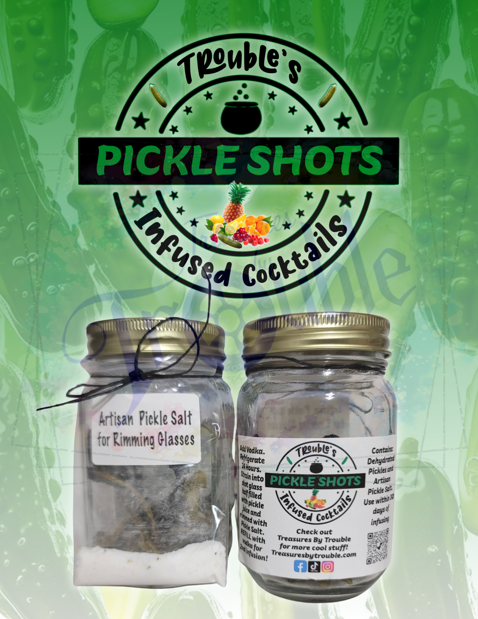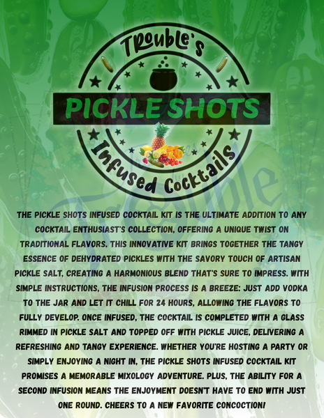 The Pickle Shots Infused Cocktail Kit is the ultimate addition to any cocktail enthusiast's collection, offering a unique twist on traditional flavors. This innovative kit brings together the tangy essence of dehydrated pickles with the savory touch of artisan pickle salt, creating a harmonious blend that's sure to impress. With simple instructions, the infusion process is a breeze: just add vodka to the jar and let it chill for 24 hours, allowing the flavors to fully develop. Once infused, the cocktail is completed with a glass rimmed in pickle salt and topped off with pickle juice, delivering a refreshing and tangy experience. Whether you're hosting a party or simply enjoying a night in, the Pickle Shots Infused Cocktail Kit promises a memorable mixology adventure. Plus, the ability for a second infusion means the enjoyment doesn't have to end with just one round. Cheers to a new favorite concoction!
