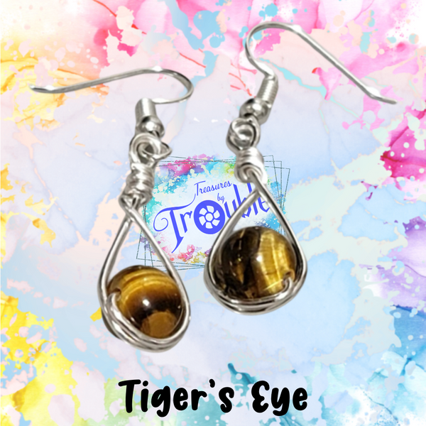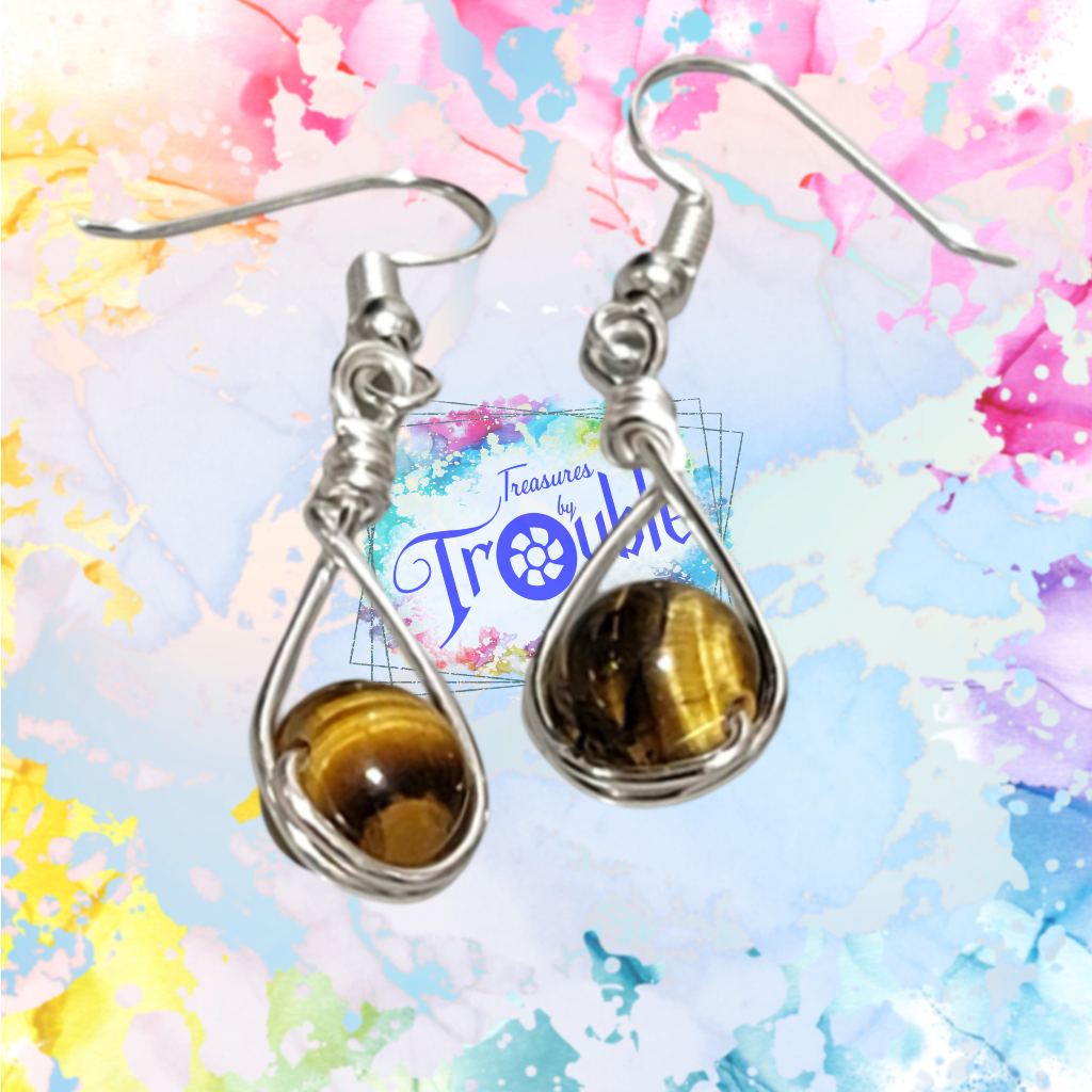 Discover the captivating beauty of tiger's eye with our handmade drop earrings. Crafted with 8mm round tiger's eye beads, these earrings are finished with silver-plated copper wire for a polished look. Embrace the earth's energy and elevate your style with these stunning earrings. Each pair is individually handmade with natural gemstone beads and may have slight variations.