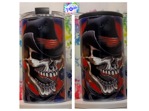 Conquer any adventure with our Rebel Skull 4 in 1 Tumbler / Can Cooler! This vacuum insulated steel tumbler with lid and straw keeps drinks warm for 6 hours or cold for 12 hours, while the rubber cooler top can fit regular or skinny cans and glass bottles. Take on the challenge and stay hydrated in style!