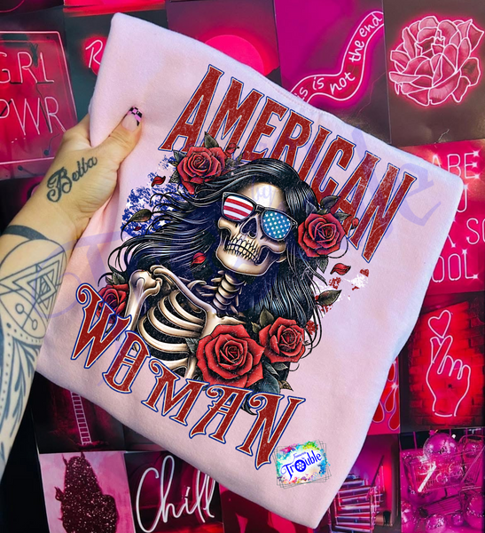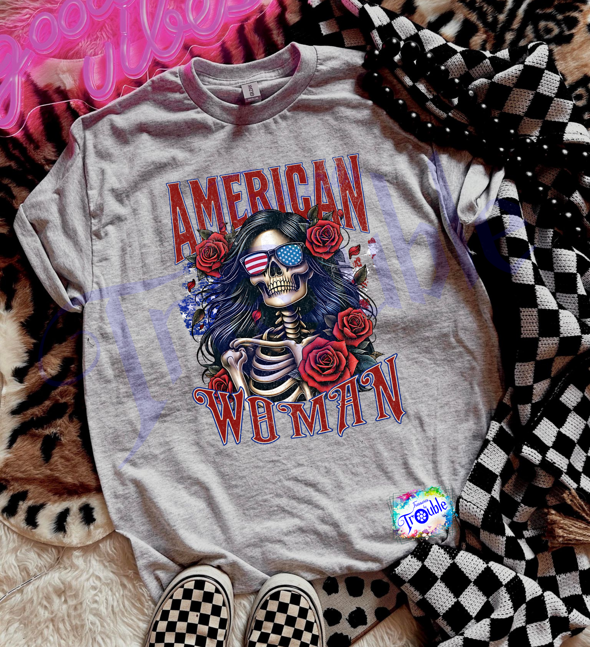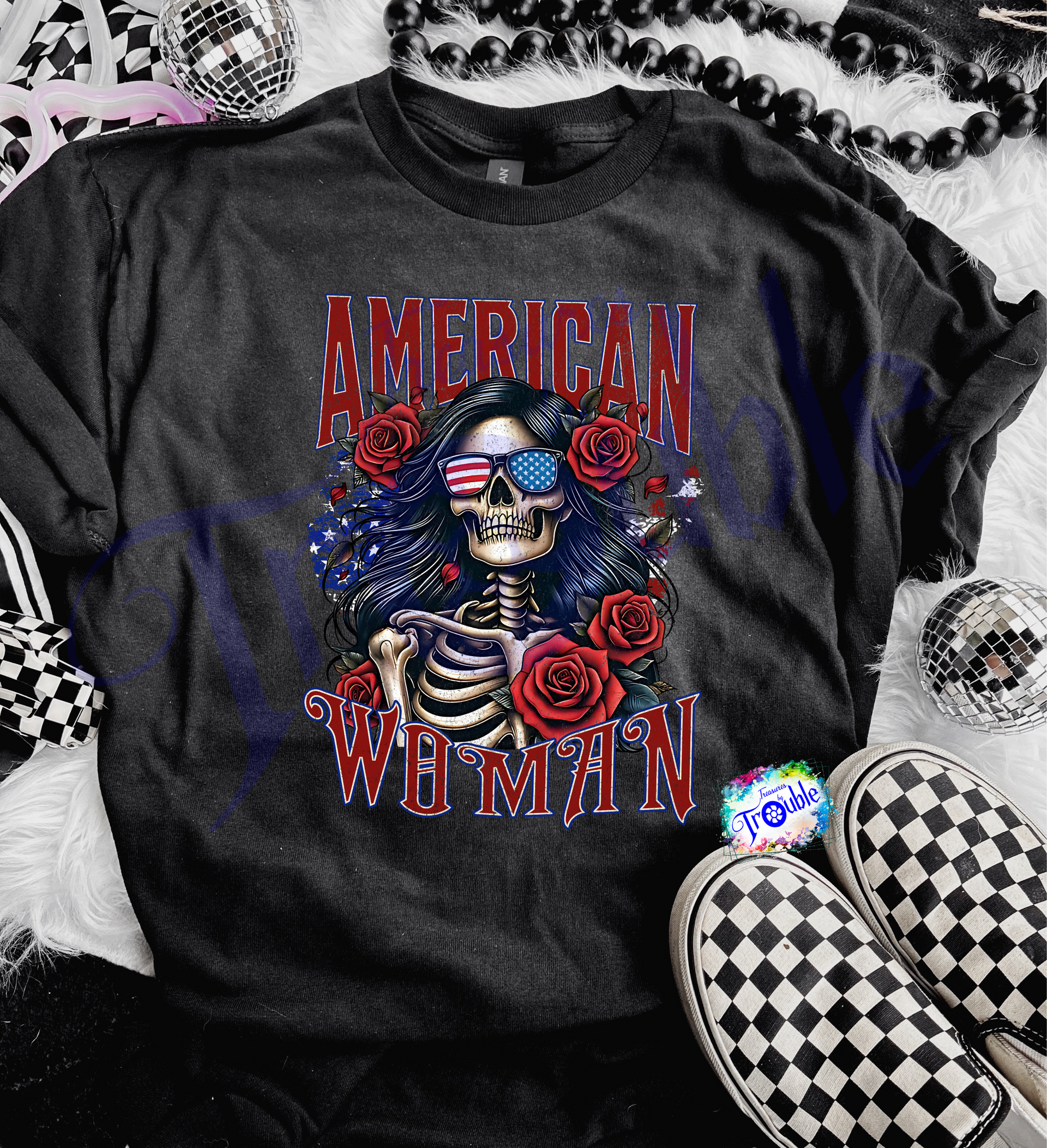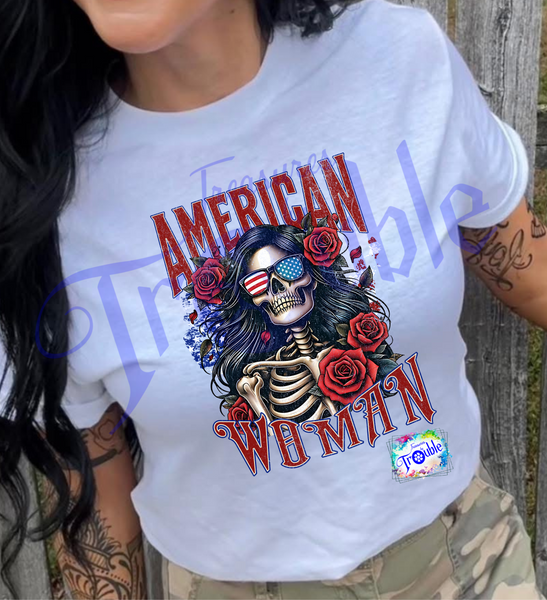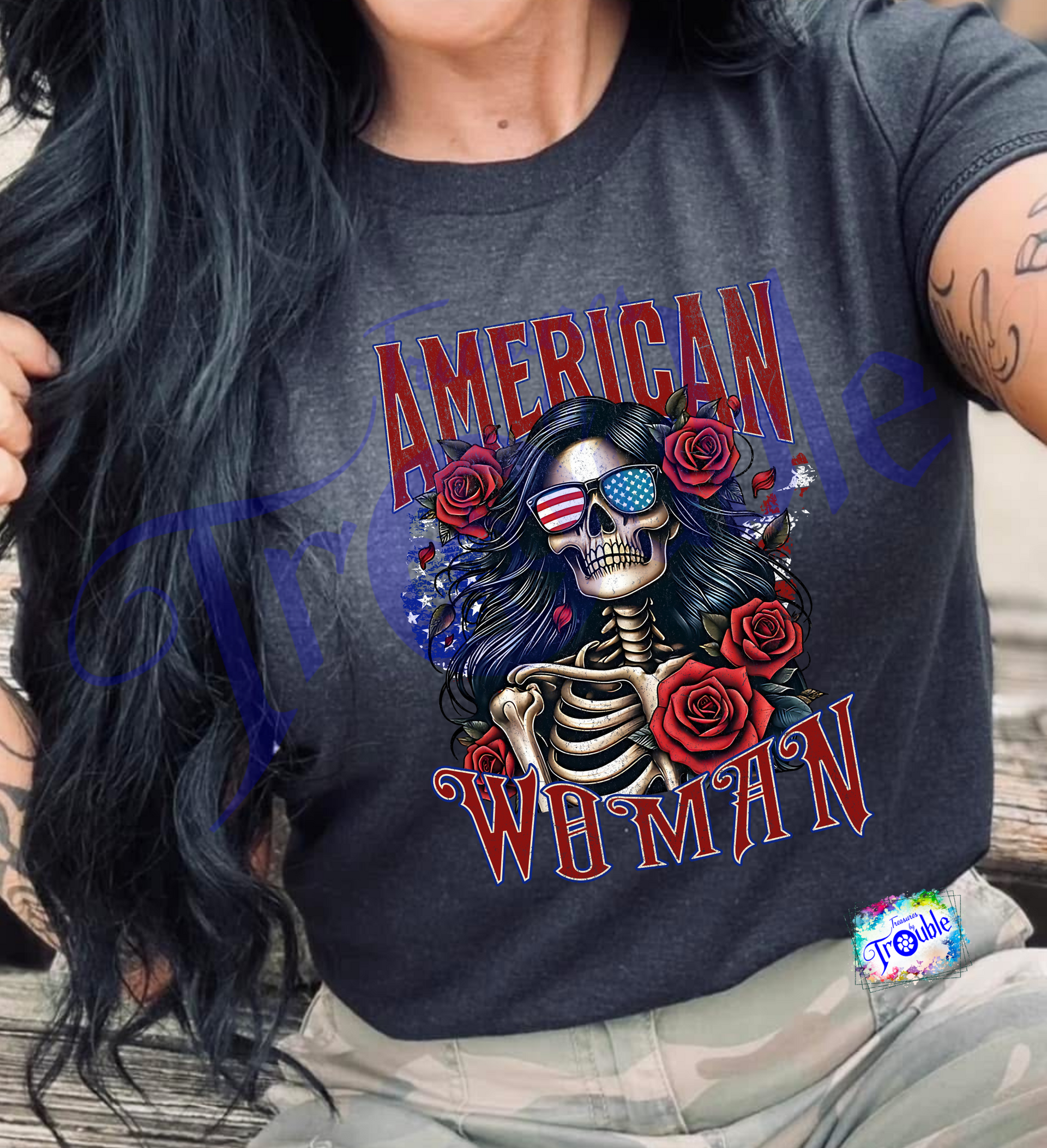Step out in style with our American Woman Cotton Short Sleeve Tee. Crafted from the softest Gildan cotton, this unisex tee is your perfect companion for those long, sunny days. Its breathable fabric ensures you stay cool and comfortable, no matter what the day brings. But it's not just about comfort - this tee is a statement. Adorned with a vibrant, high-quality patriotic skeleton DTF image, it's a nod to your unique style and love for your country. Whether you're heading to a barbecue or a casual day out, this tee is sure to turn heads. So why wait? Embrace your patriotic spirit with our American Woman Cotton Short Sleeve Tee today!