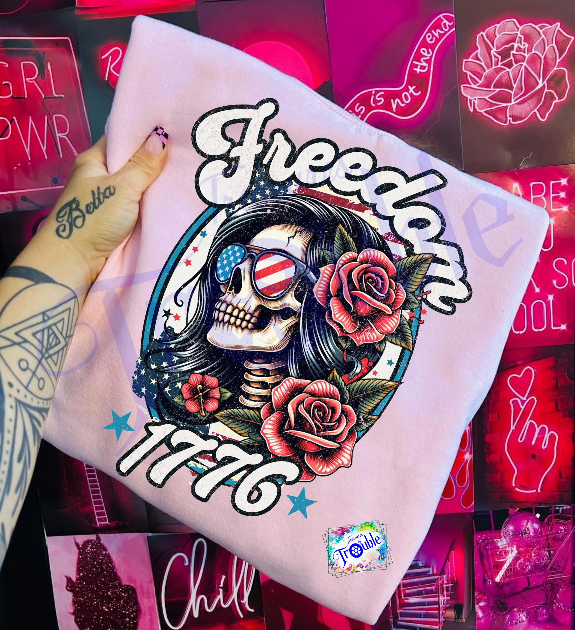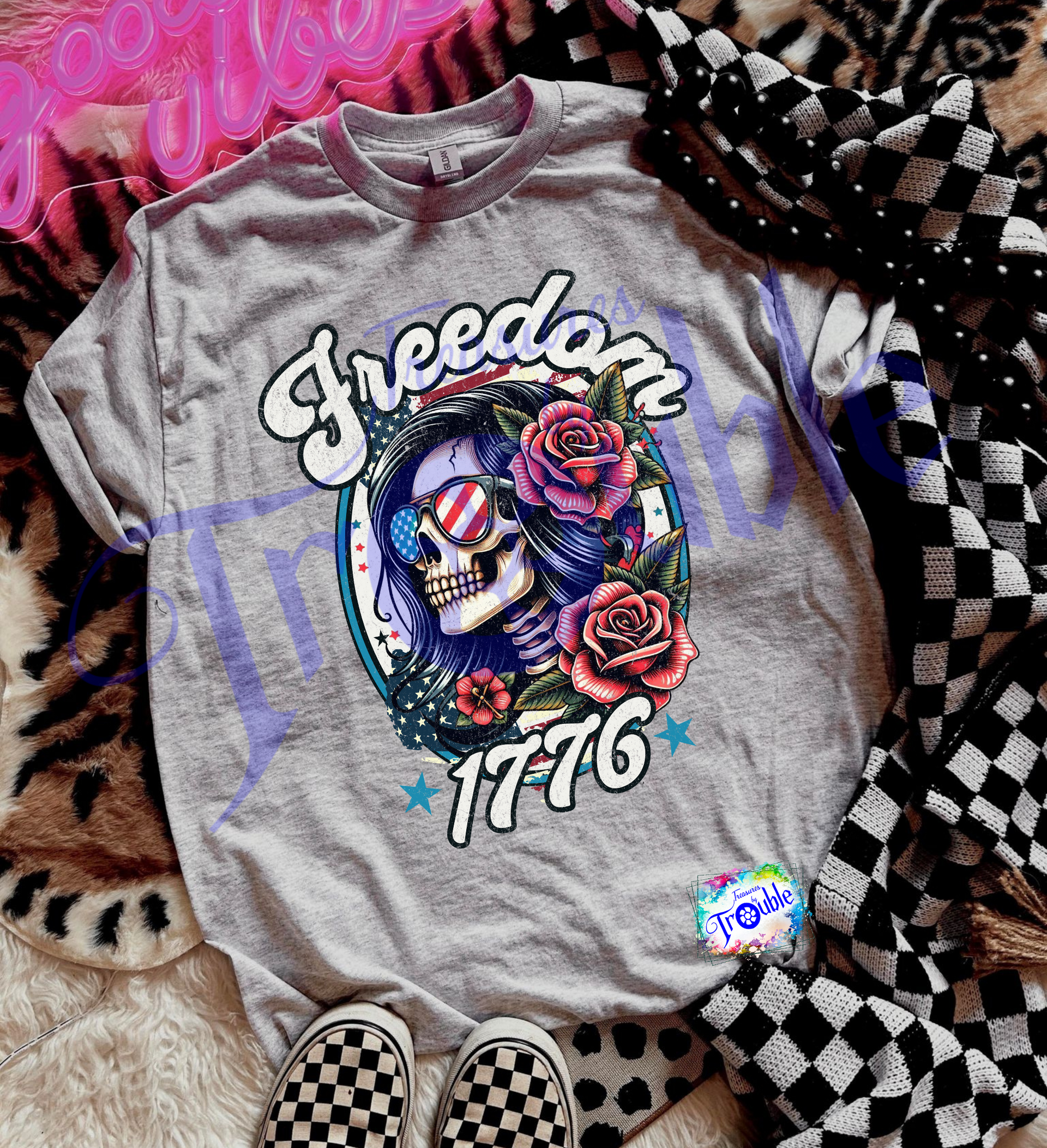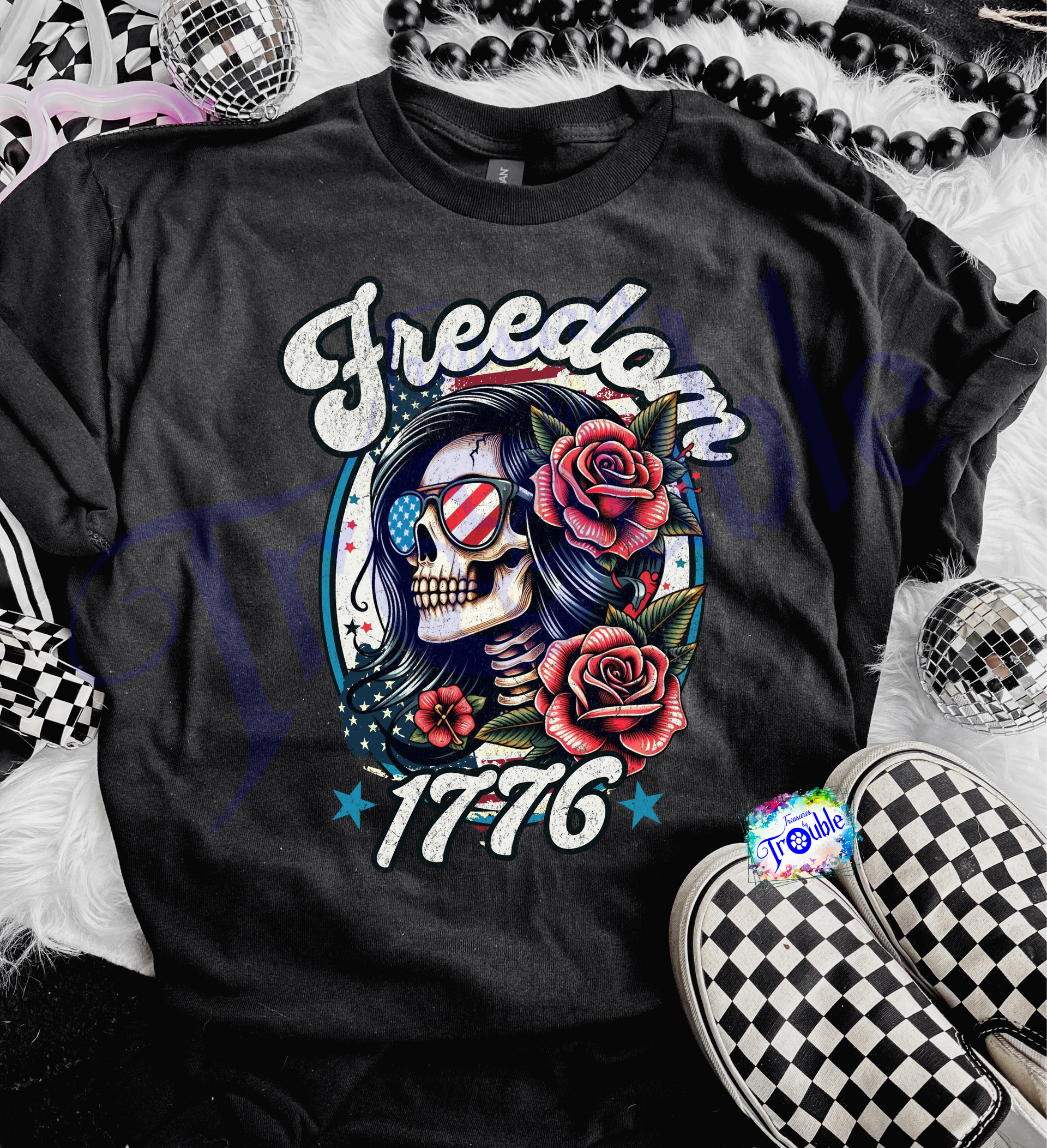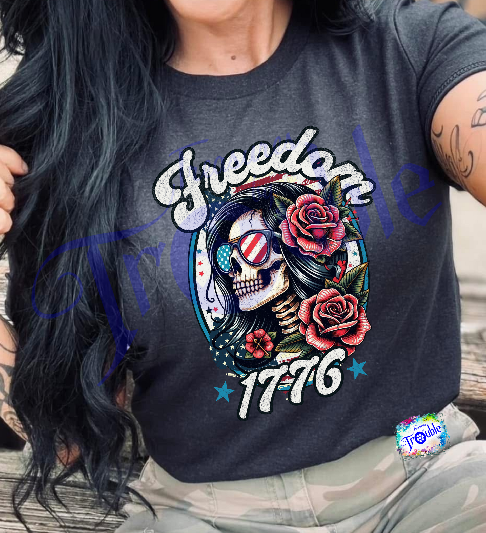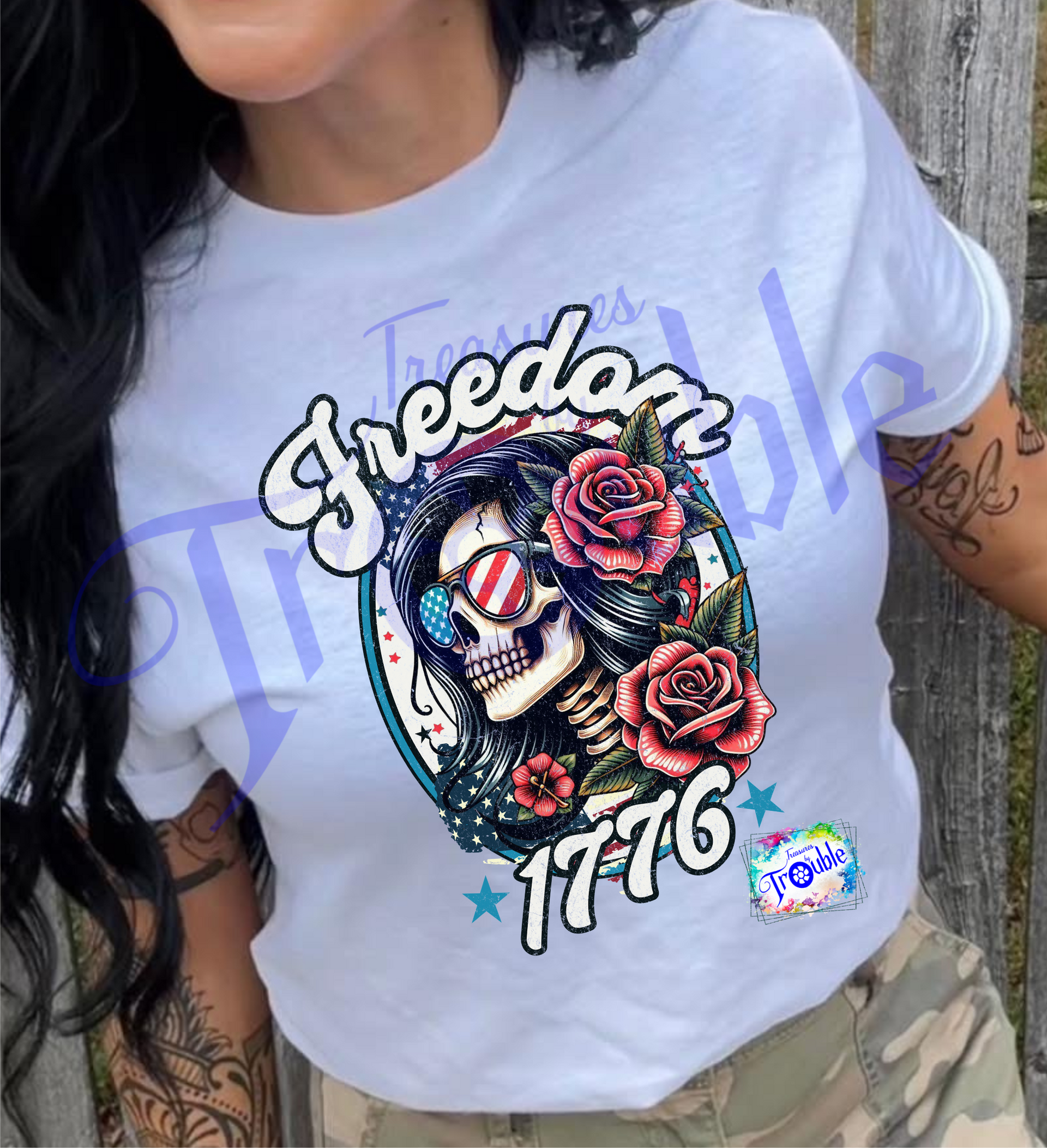 Introducing our Freedom 1776 Cotton Short Sleeve Tee - a perfect blend of comfort, style, and patriotism. Crafted from soft, breathable Gildan cotton, this unisex tee promises to keep you comfortable throughout the day. The highlight of the tee is its vibrant, high-quality DTF image of a patriotic skeleton, adding a playful and stylish touch to the shirt. This unique design is sure to make a statement, making it an ideal choice for both mischief-makers and those who prefer a laid-back style. Upgrade your wardrobe with our Freedom 1776 Cotton Short Sleeve Tee and embrace a look that's as unique as you are!