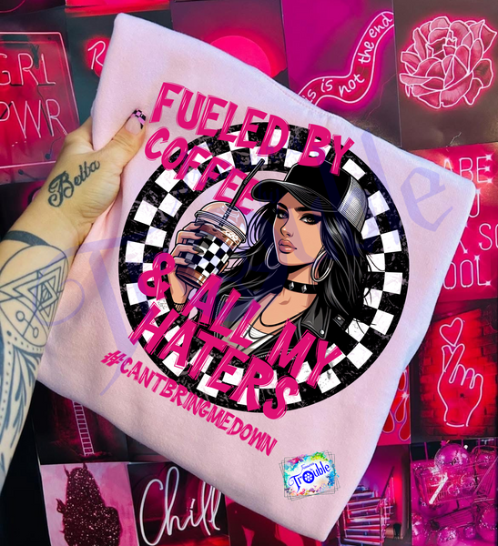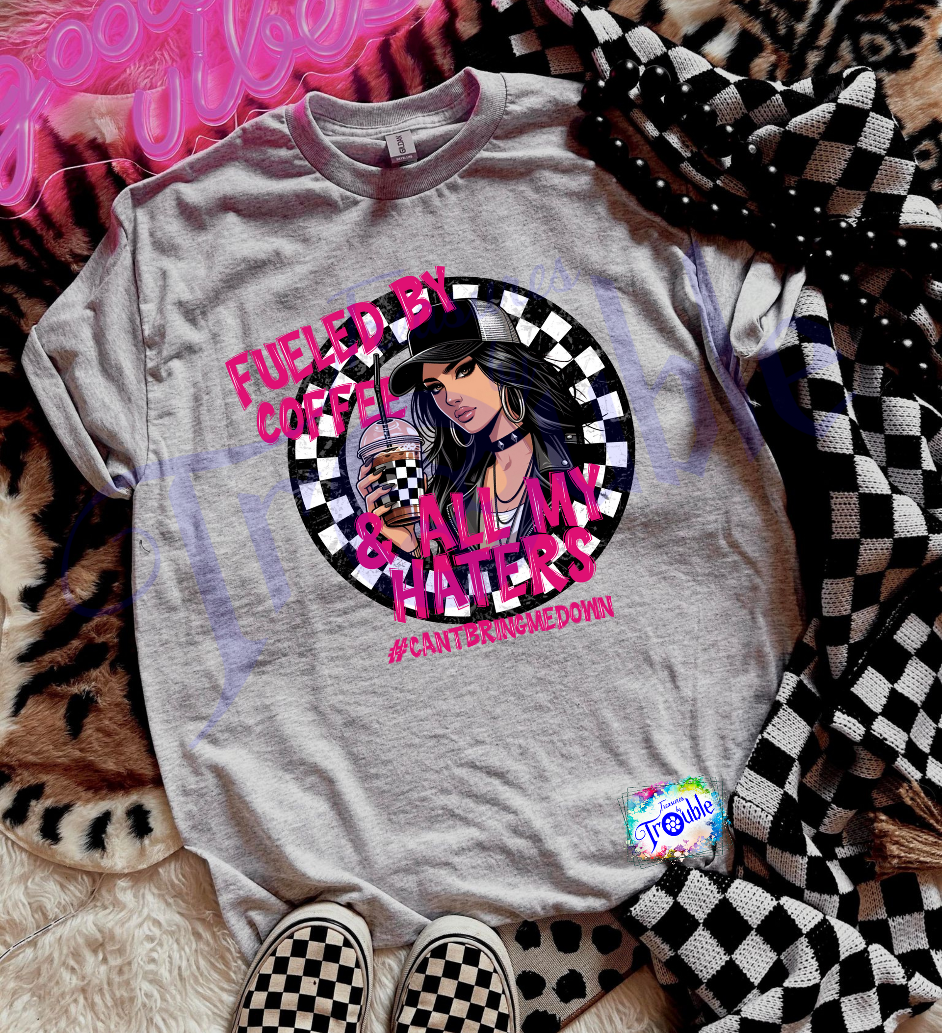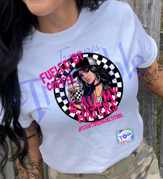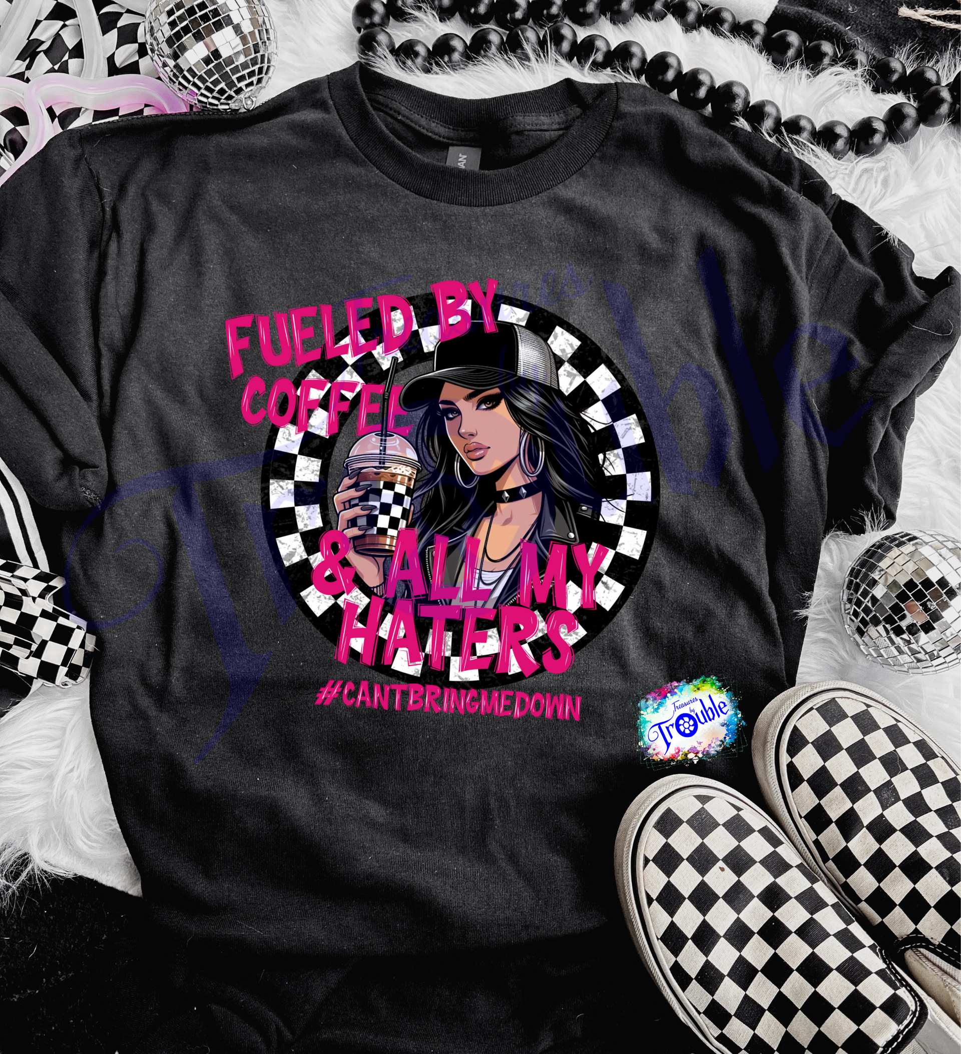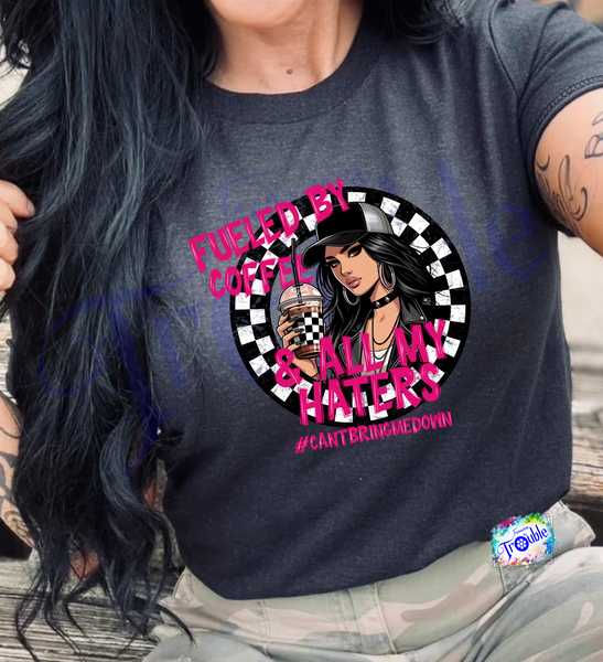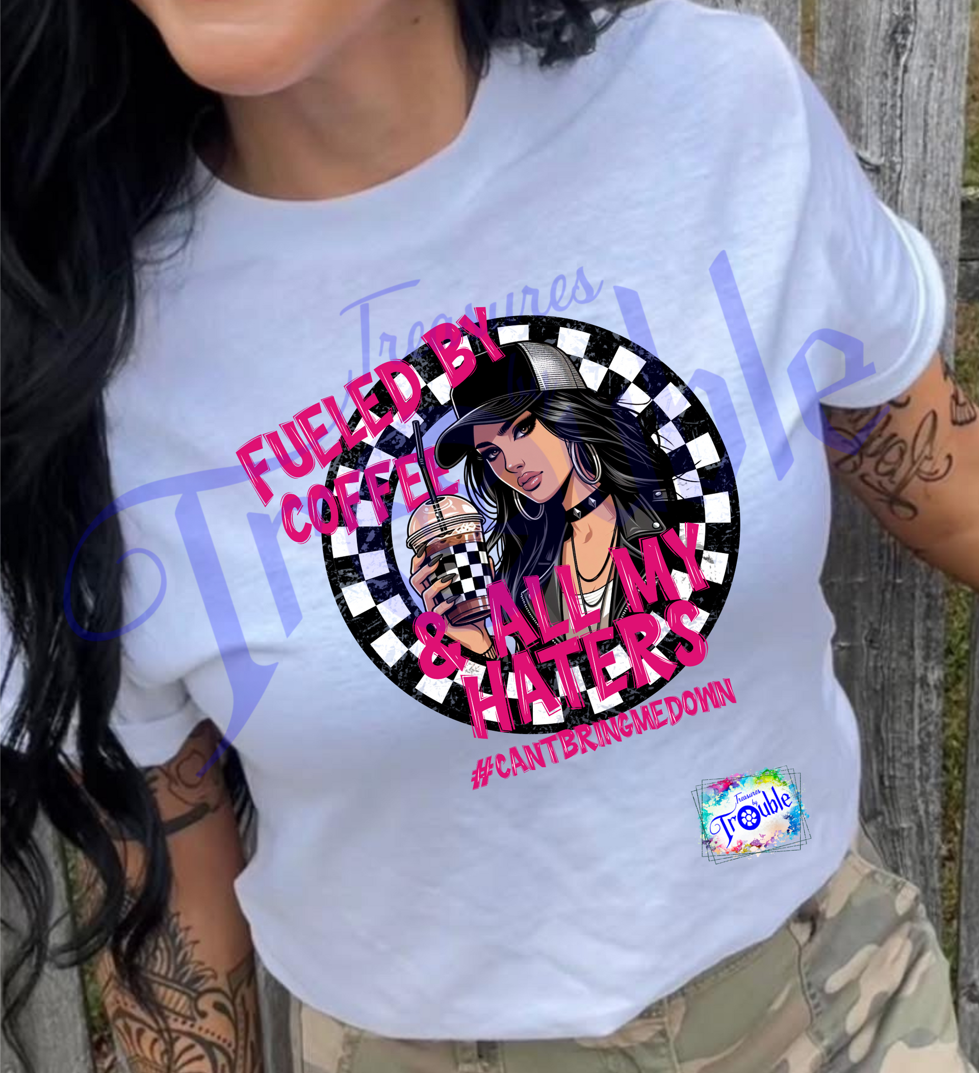 This unisex Cotton Short Sleeve Tee, made with soft Gildan Cotton and a high-quality DTF image, adds a splash of fun and attitude to your everyday look. Perfect for causing mischief or just chilling, it's comfortable and stylish. Fuel your day with the power of coffee and show off your confidence in the face of haters.