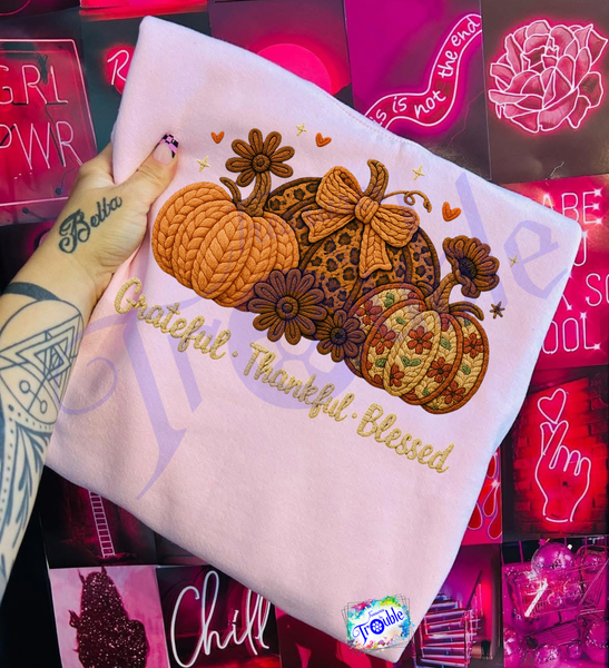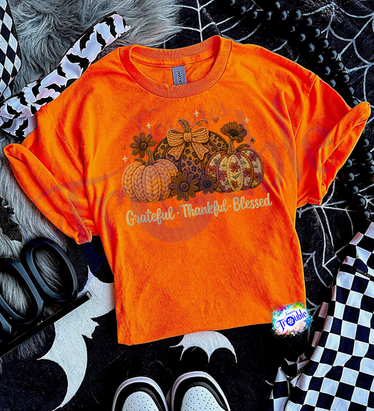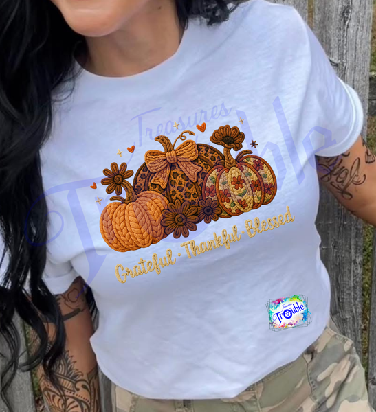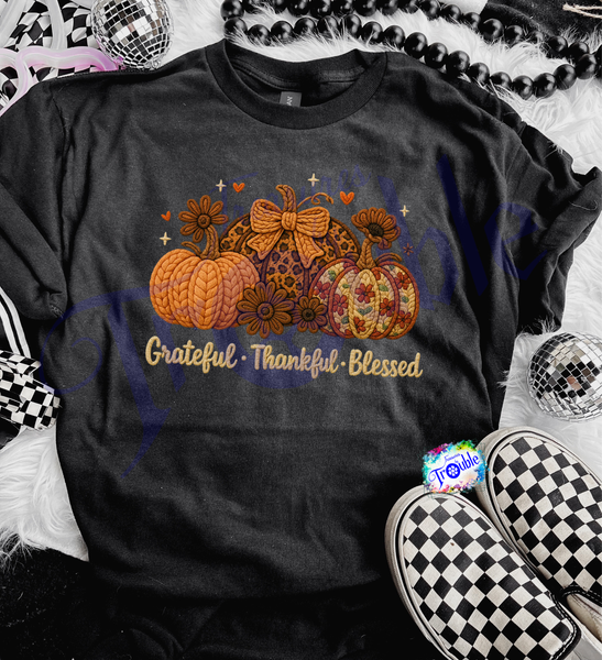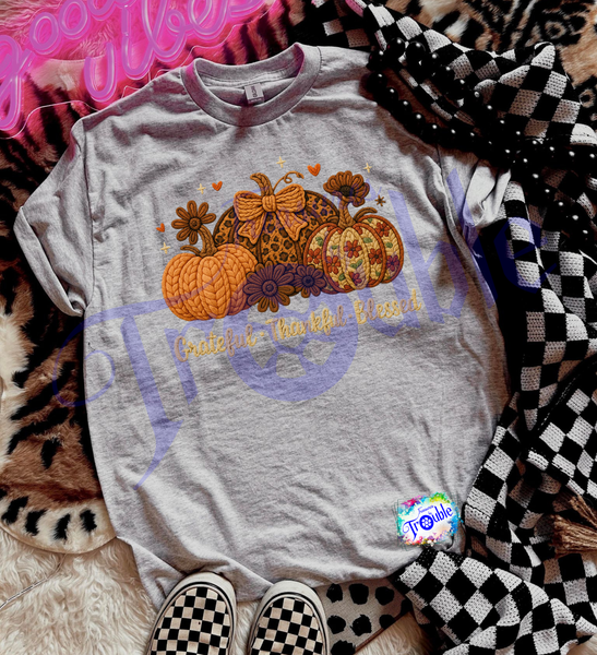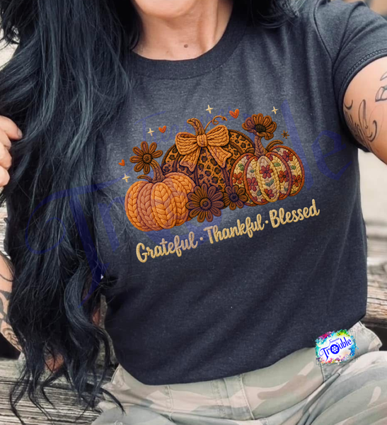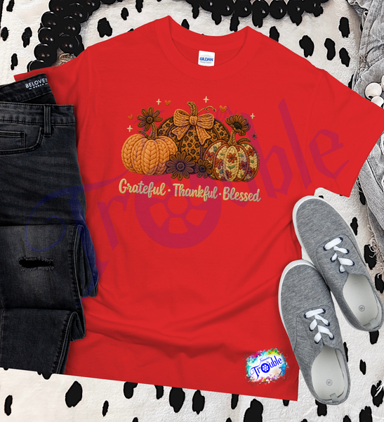 Elevate your fall style with our Grateful, Thankful, Blessed Faux Yarn Tee. Made of soft and breathable Gildan cotton, this unisex shirt keeps you comfortable all day. Its bold DTF image adds a playful touch to your holiday wardrobe. Turn heads and spread gratitude with this high-quality shirt!