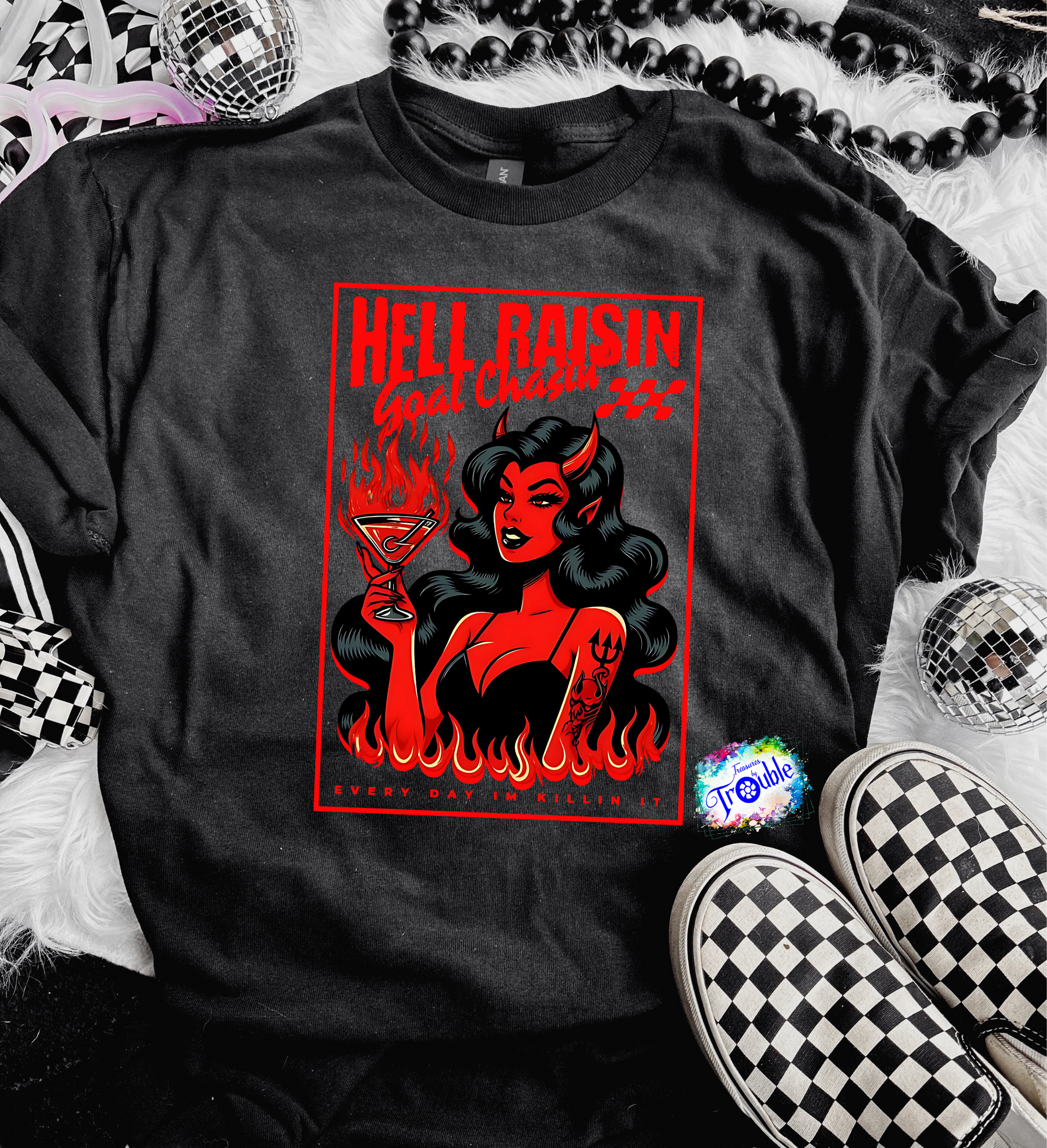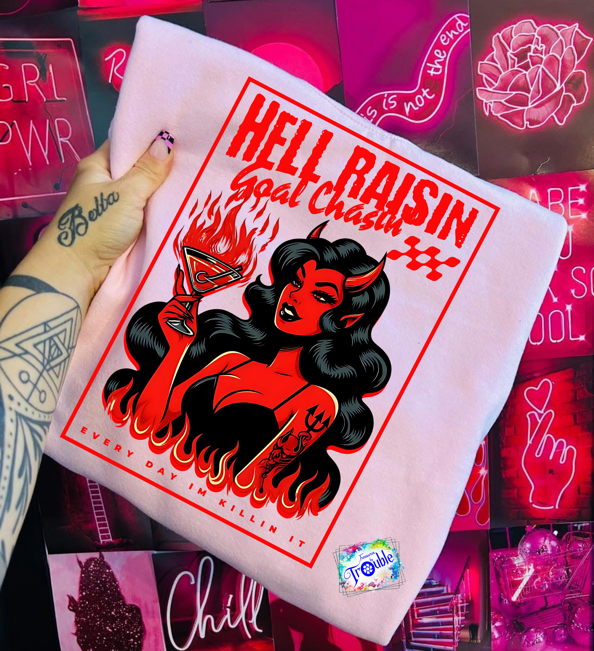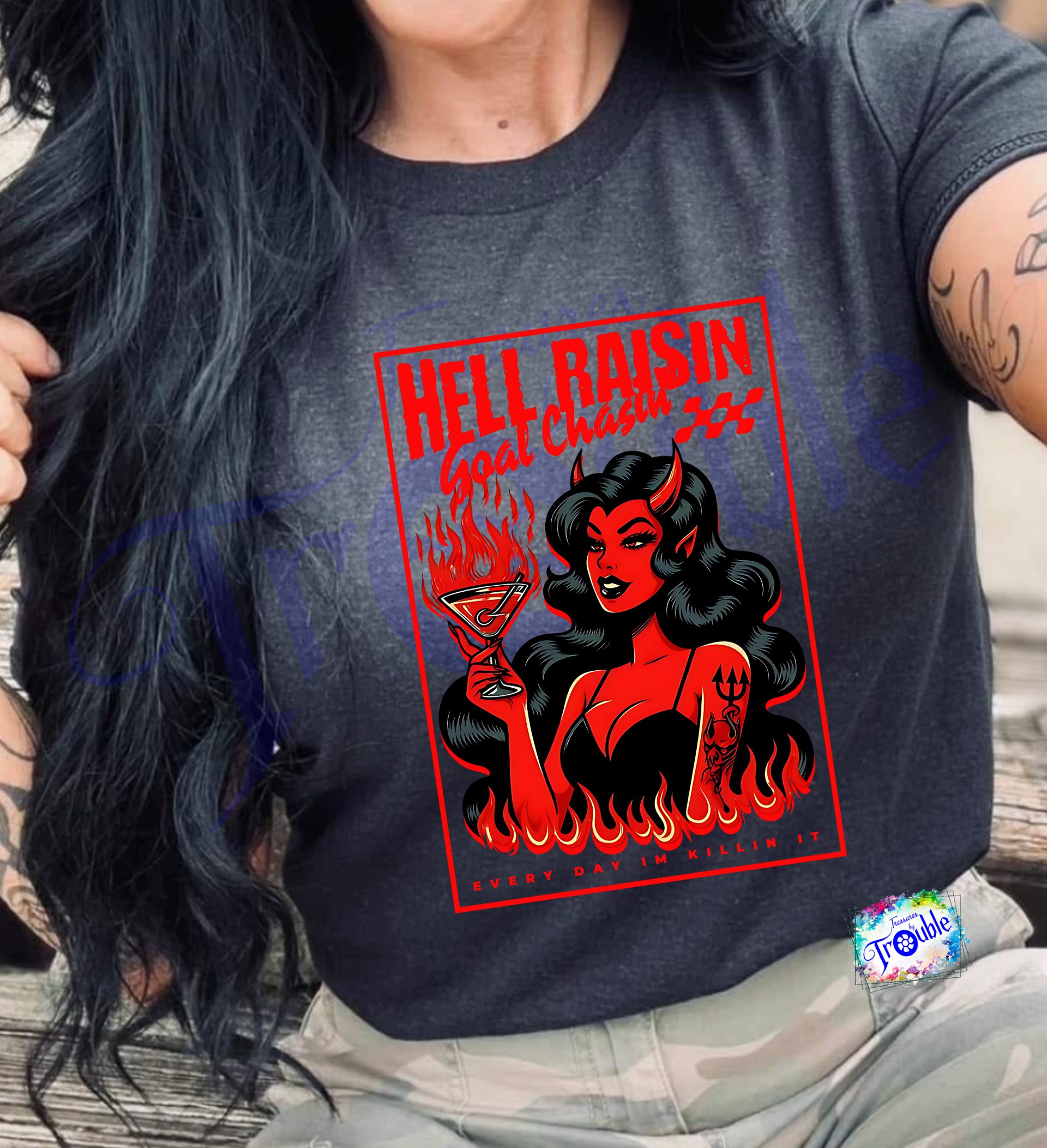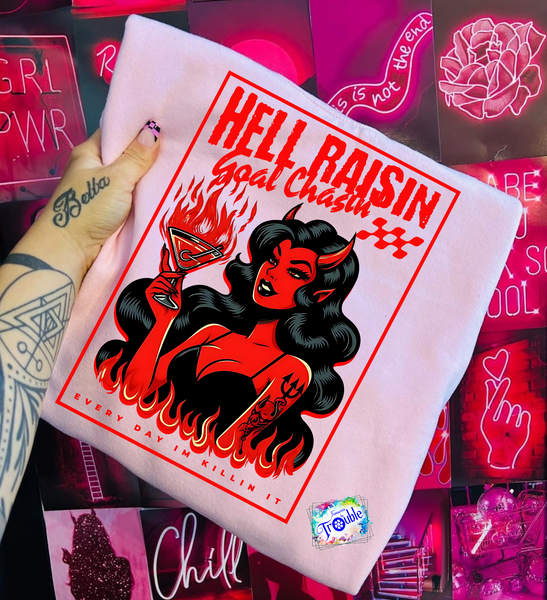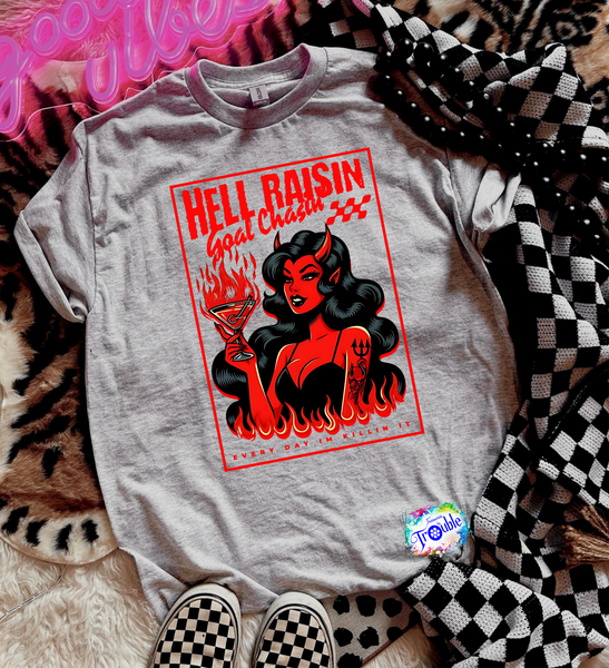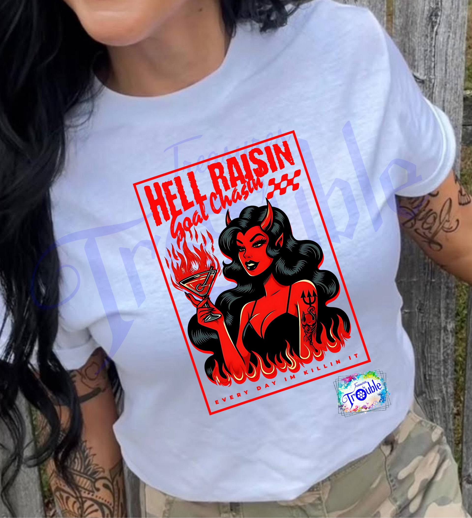 Unleash your inner risk-taker with the Hell Raisin’ Goal Chasing Cotton Short Sleeve Tee. Made from soft, breathable Gildan cotton, this unisex shirt keeps you comfy while its vibrant, high-quality DTF image adds a splash of fun and attitude to your everyday look. Chase your goals in style!