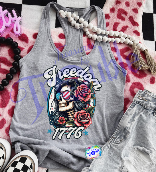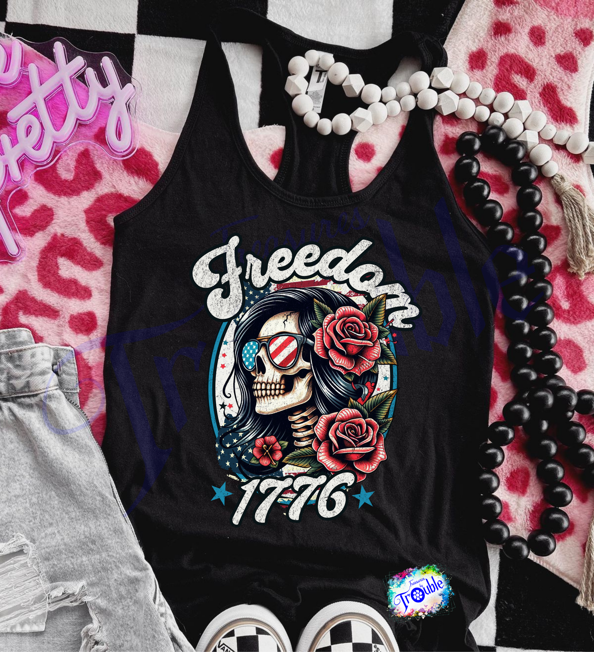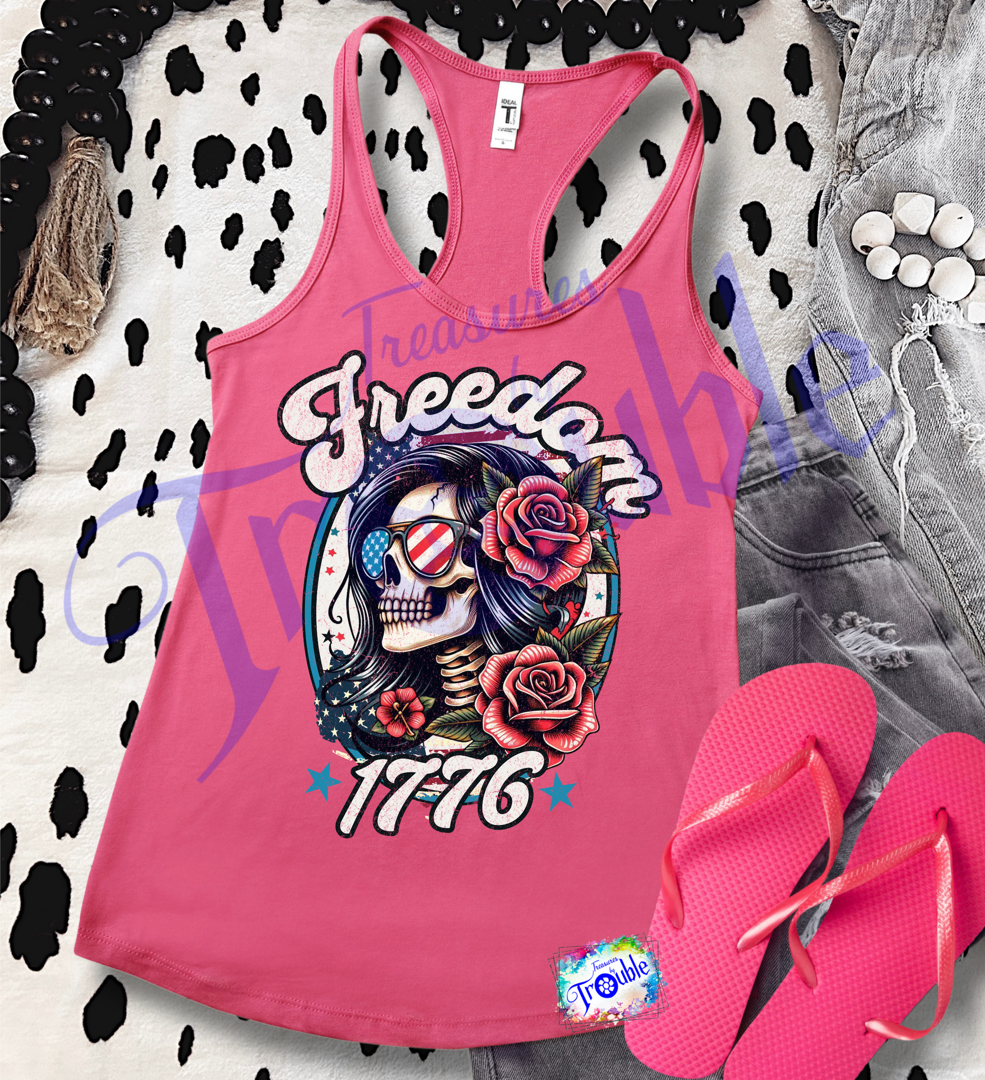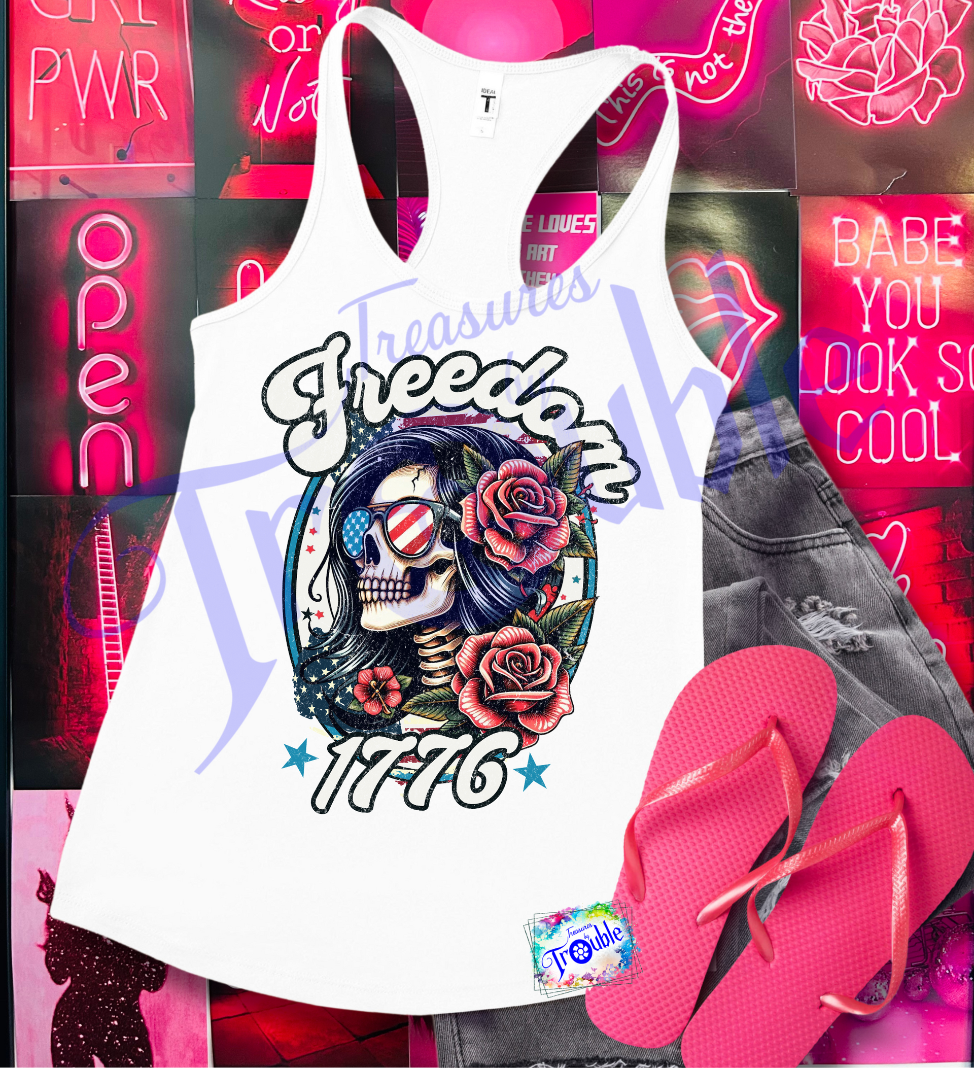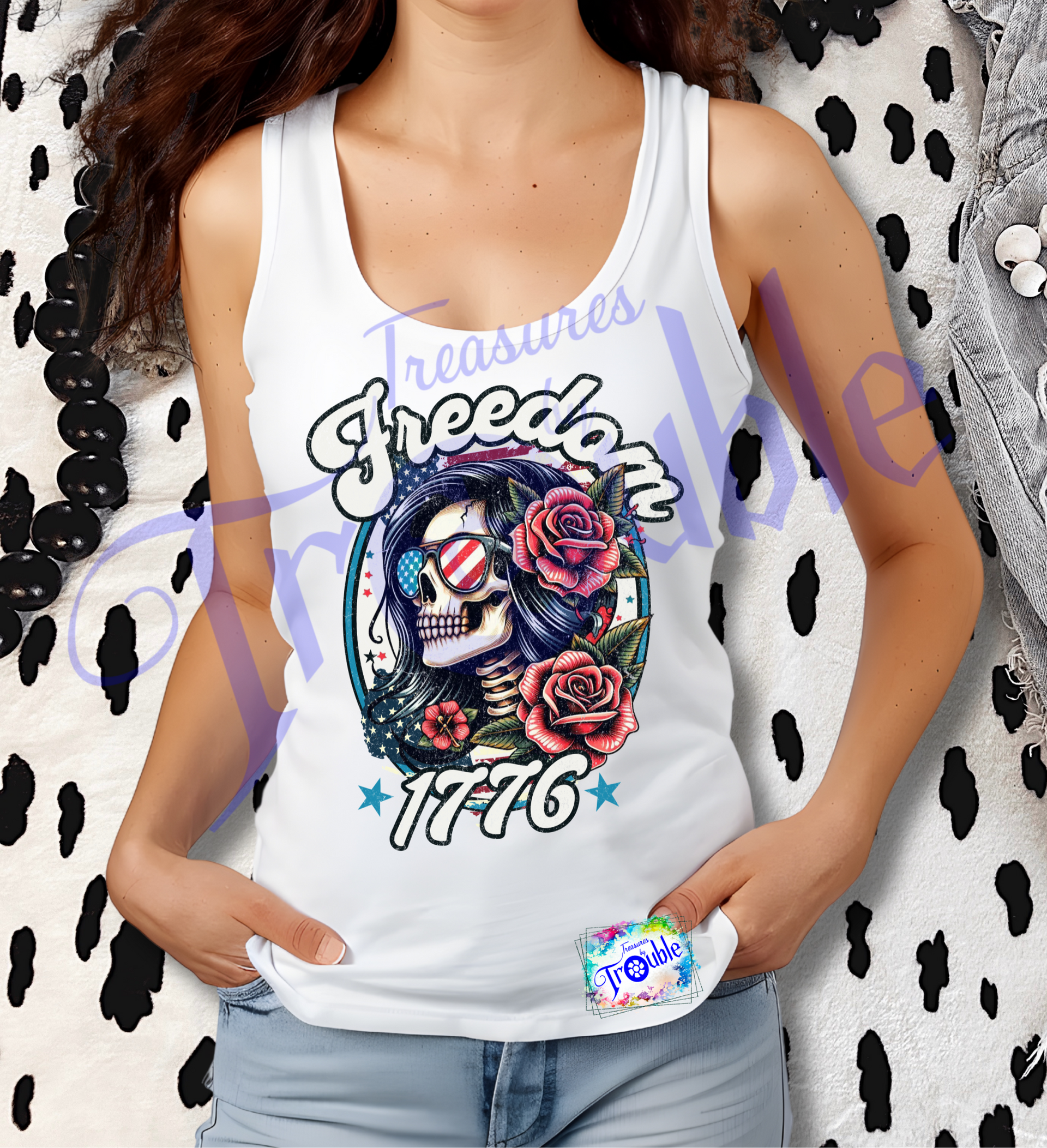 Unleash your bold and adventurous spirit with the Freedom 1776 Cotton Racerback Tank Top. Made with high-quality DTF patriotic skeleton design, this ladies tank will keep you stylish while showing off your love for your country. Get ready to take on new challenges with this unique and comfortable tank top!