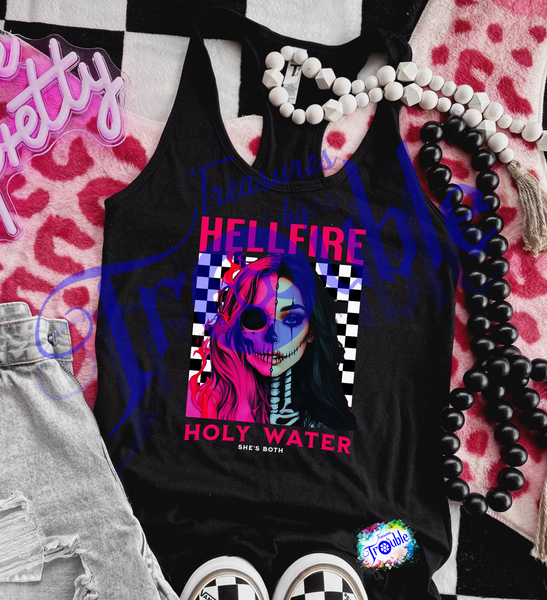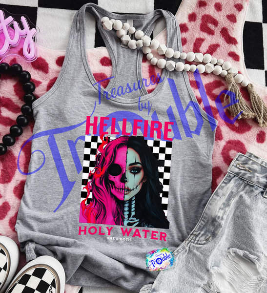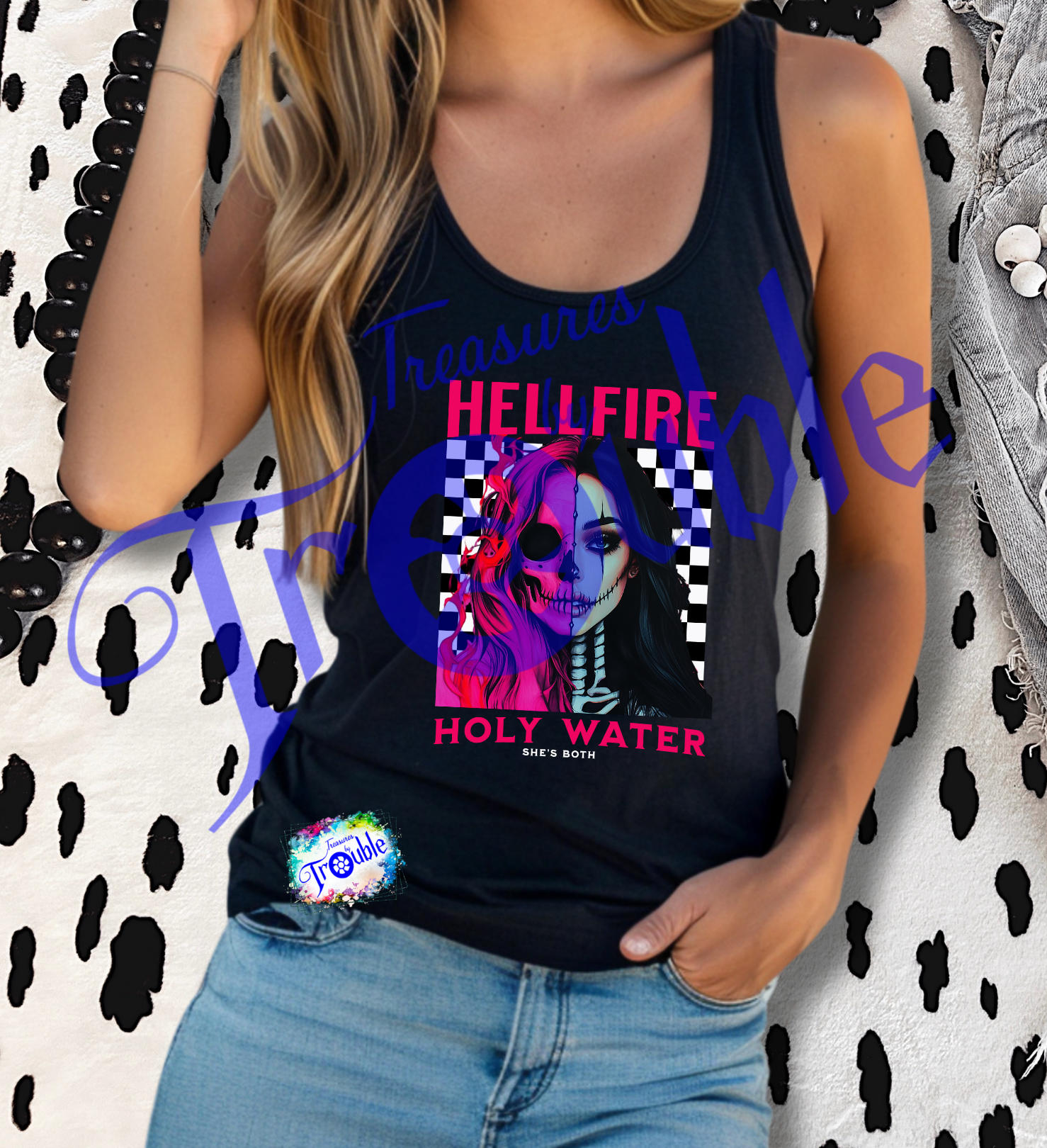 Unleash your inner fire with our Hellfire and Holy Water Cotton Racerback Tank Top! Made with soft cotton and a sleek racerback design, this Next Level tank top showcases a high quality DTF design that will turn heads. Embrace your unique style with this unique and playful top.