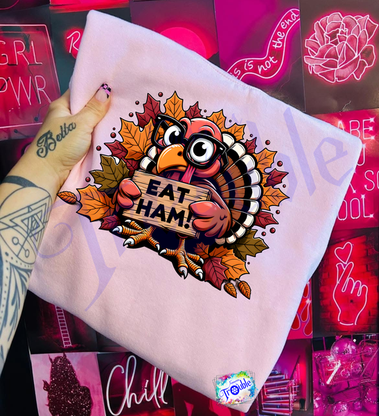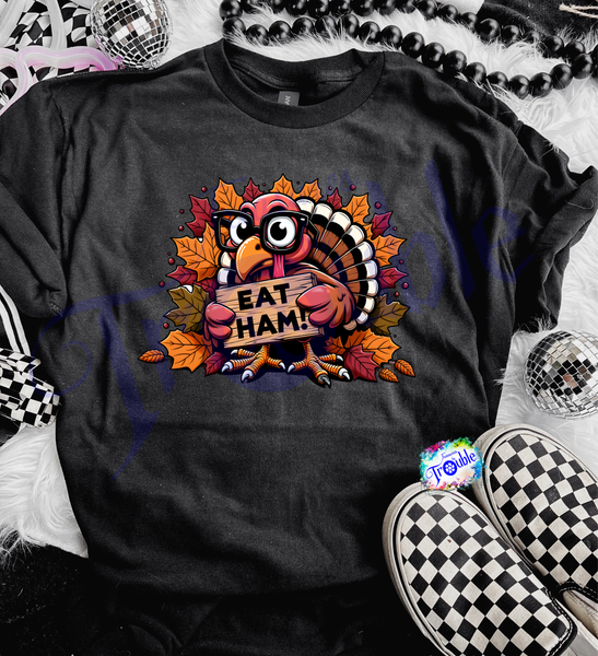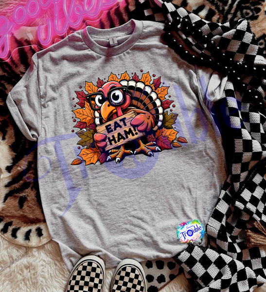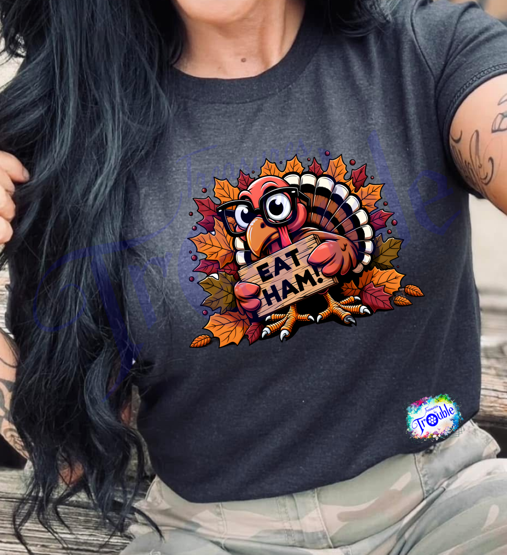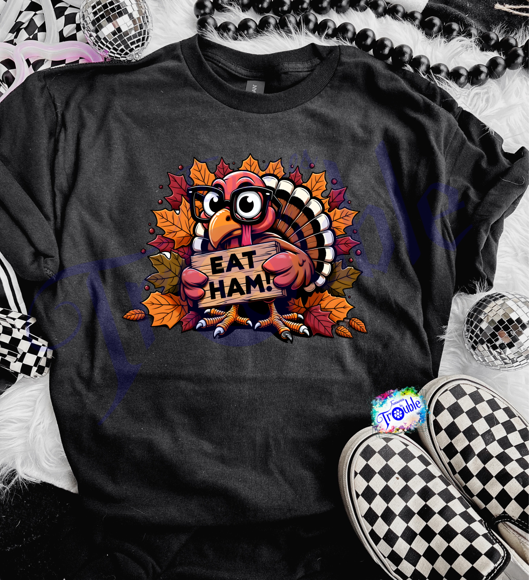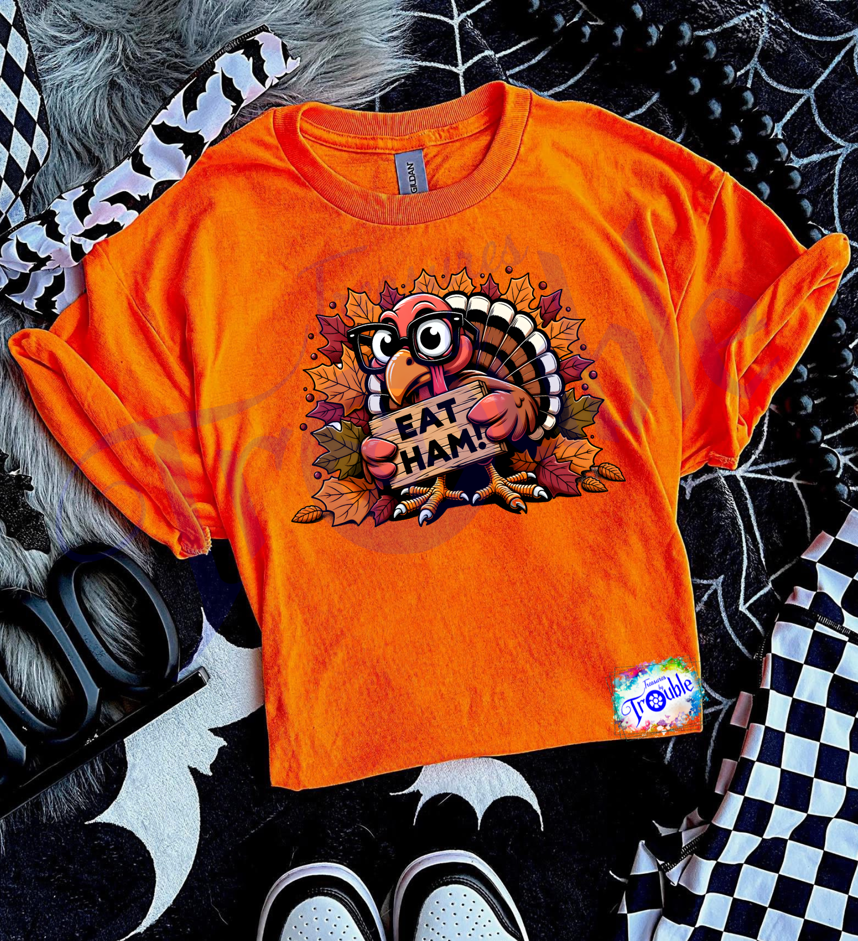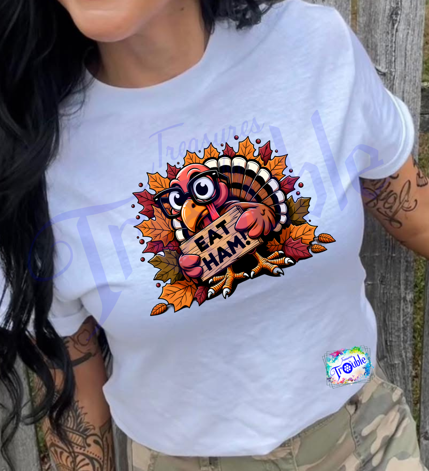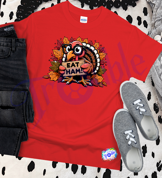 Get ready to gobble up compliments with this Eat Ham Funny Thanksgiving Tee! Made from soft, breathable Gildan cotton, this unisex shirt keeps you comfortable all day. The bold DTF image adds style and spreads gratitude wherever you go. Elevate your fashion game with this high-quality, quirky shirt!