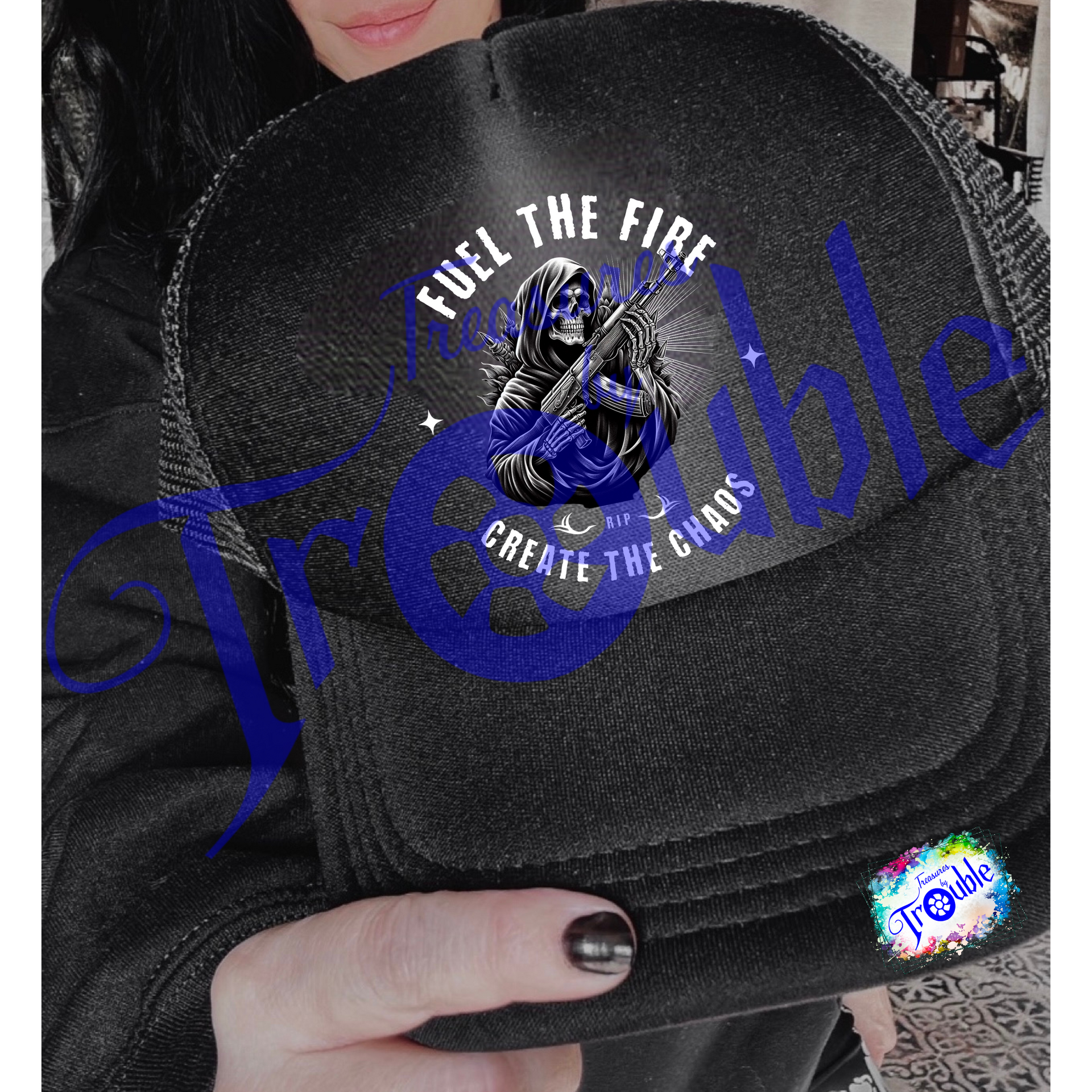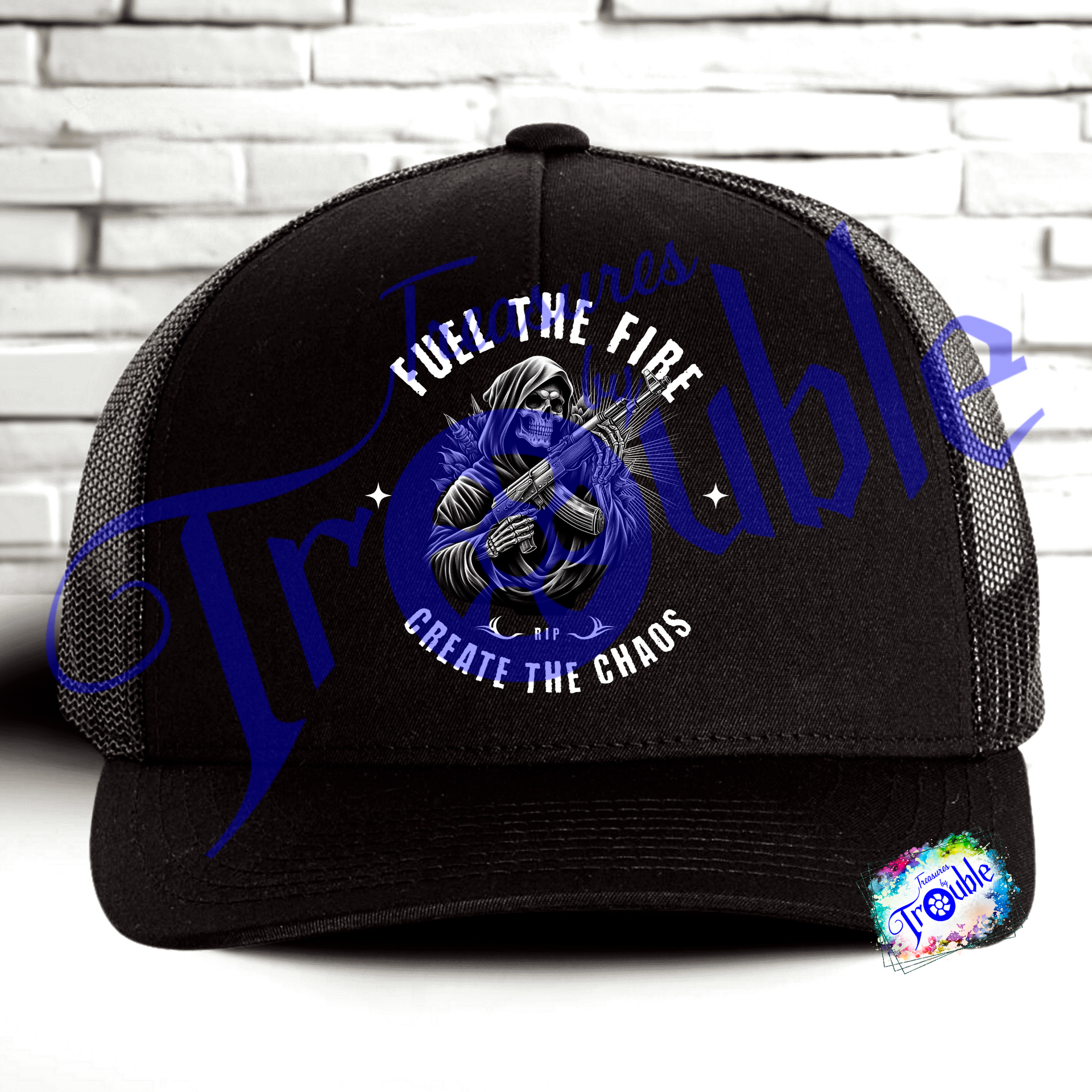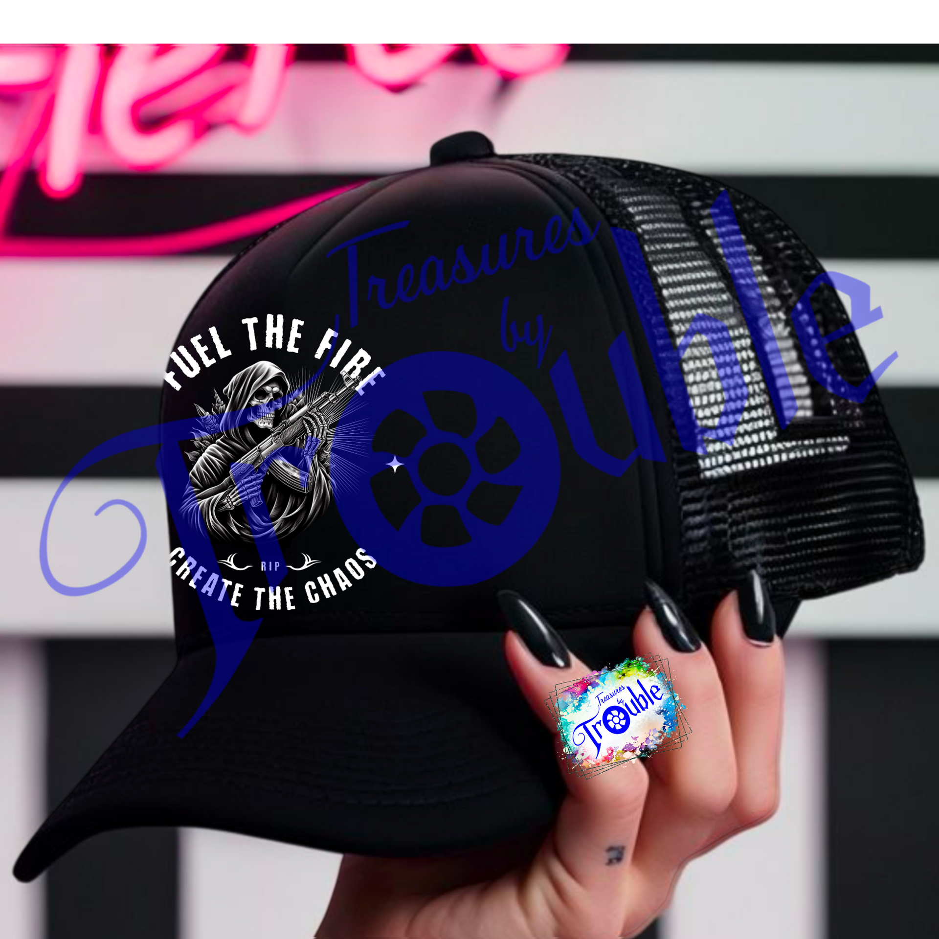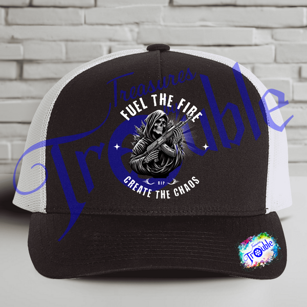 Unleash your wild side with the Fuel the Fire trucker hat. The 5-panel high crown design and mesh back provide a breezy and comfy fit, while the snapback ensures adjustability. With a DTF print that's long-lasting and multiple color options, you can match your vibe and make a statement. And don't forget to check out the matching shirt for the ultimate troublemaker outfit!