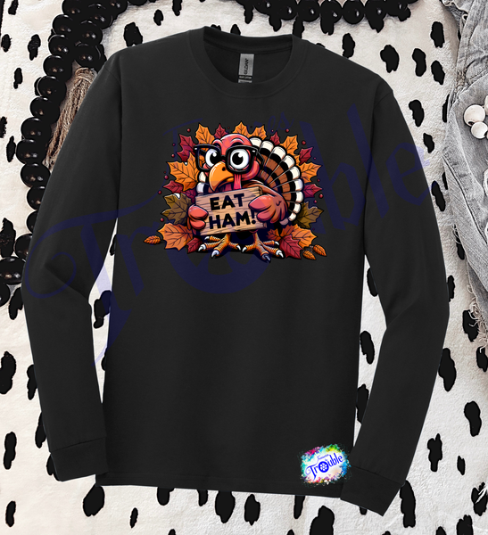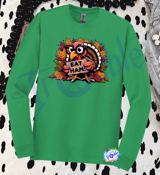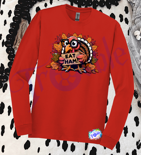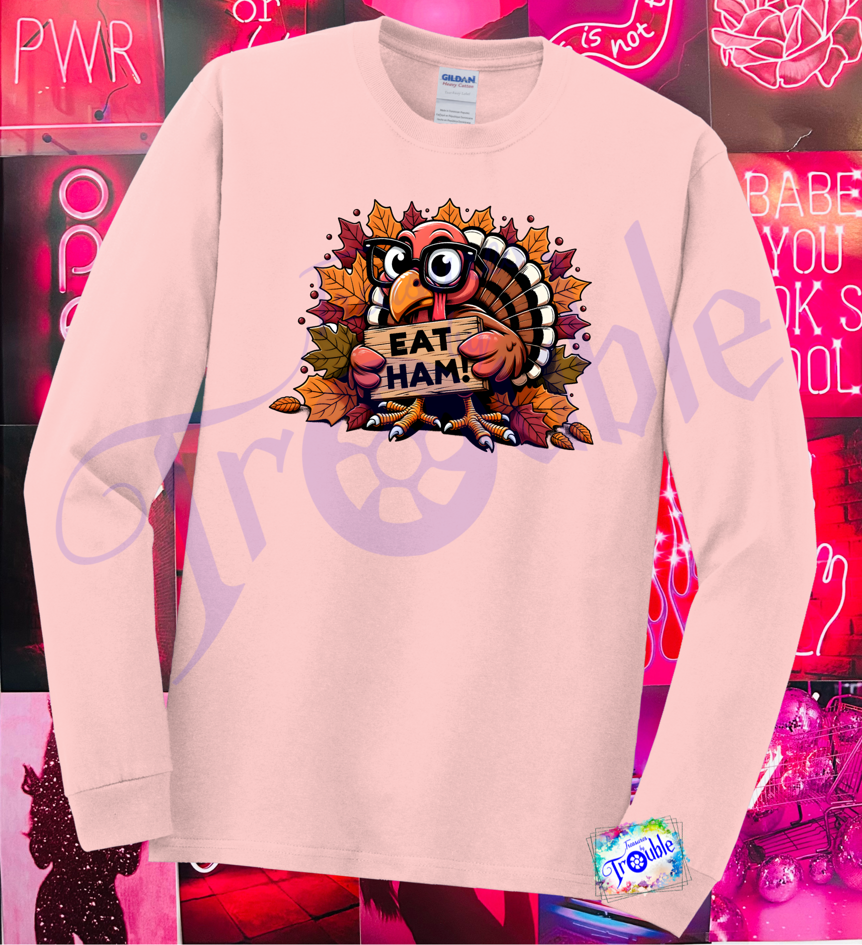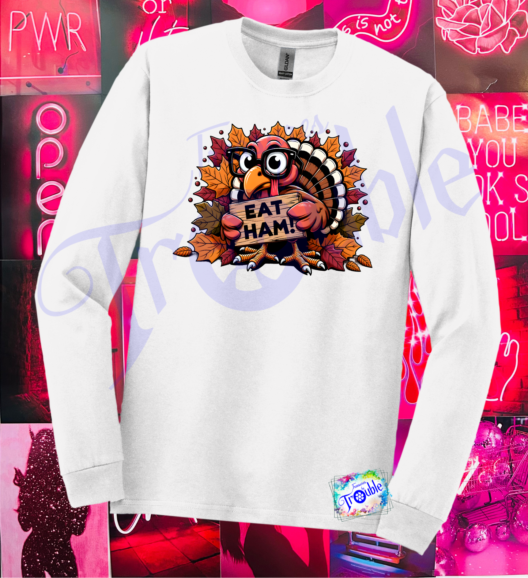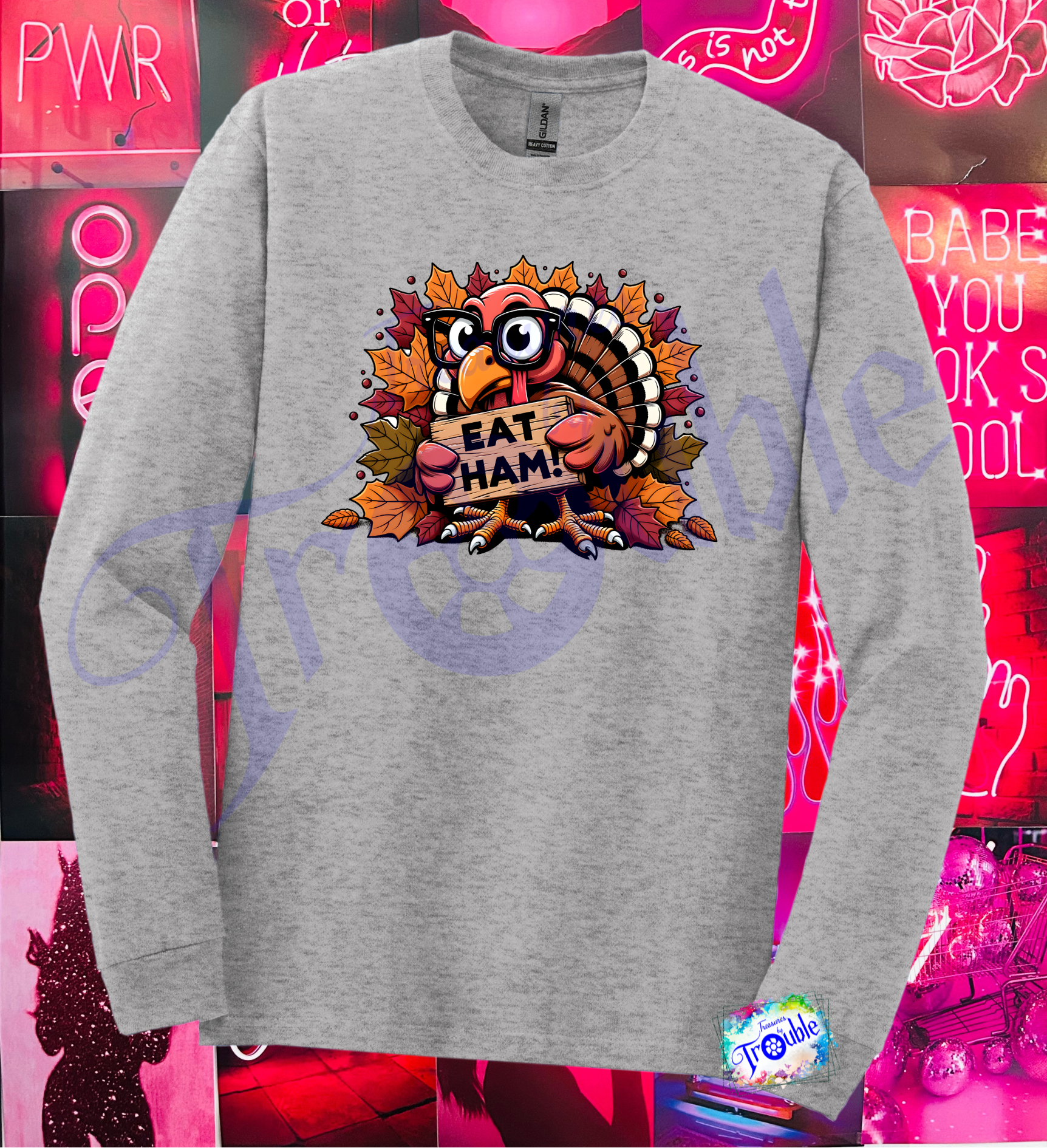 Unleash your autumn love with this hilarious Thanksgiving long sleeve tee! Made from soft, breathable Gildan cotton, this unisex shirt features a high-quality DTF image that adds playful, stylish flair to any outfit. Get ready to eat ham and spread holiday cheer with this comfortable, eye-catching tee.