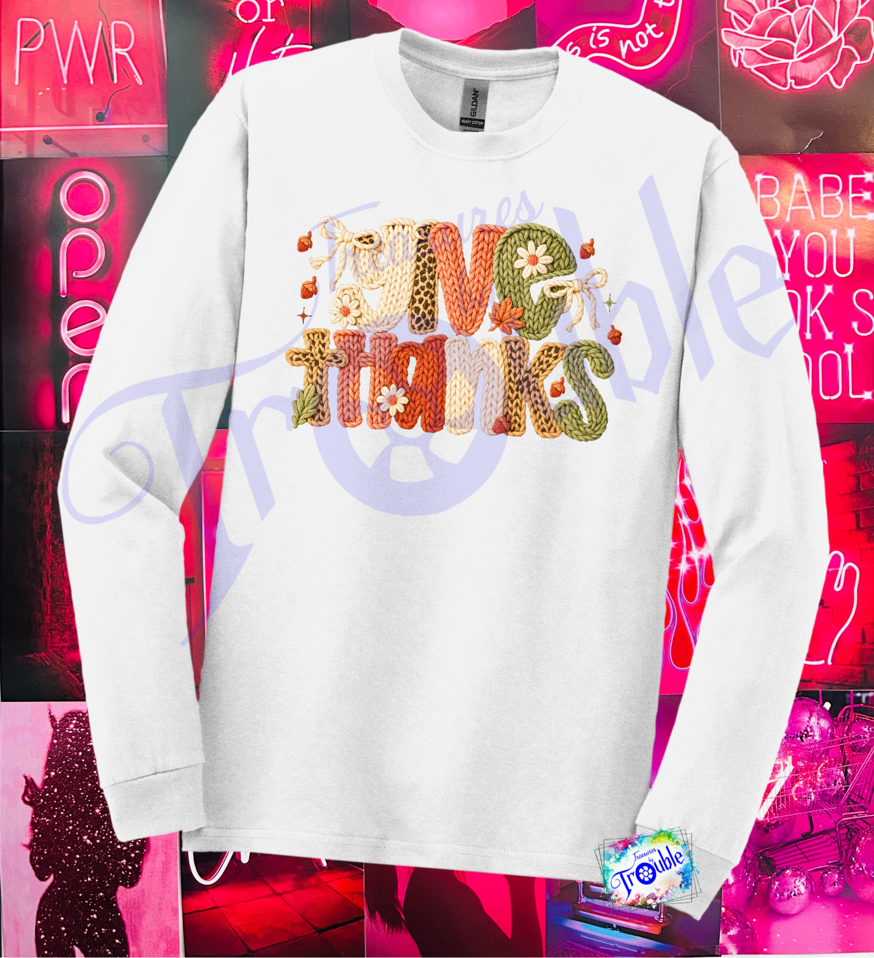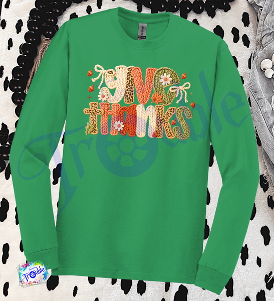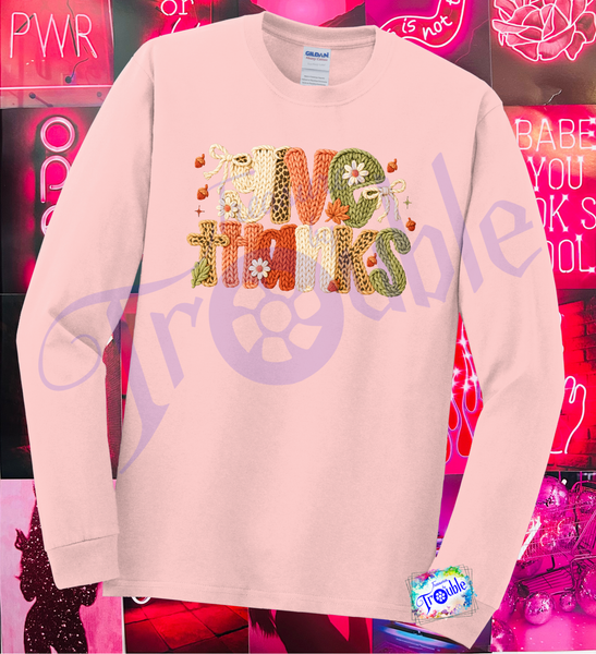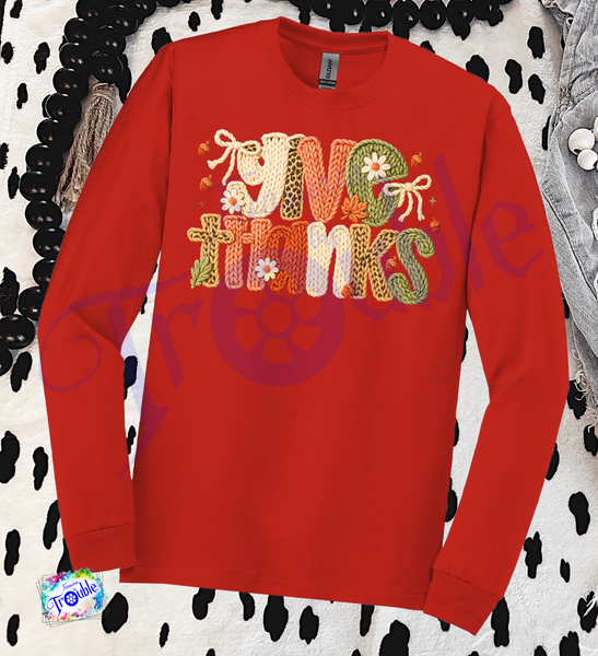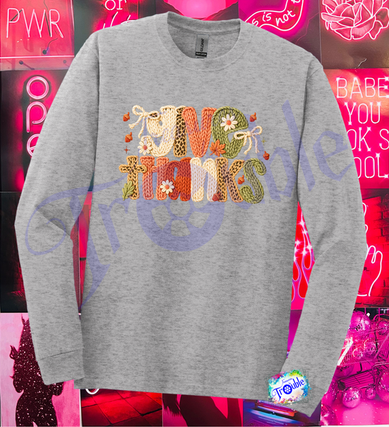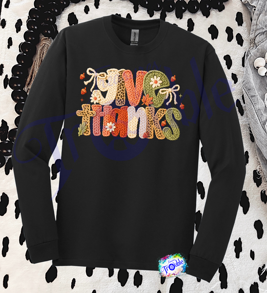 Introducing our Give Thanks Faux Yarn Cotton Long Sleeve Tee - the perfect way to show off your festive spirit! Made with soft and breathable Gildan cotton, this unisex shirt features a high-quality faux yarn DTF image. Add playful and stylish flair to your wardrobe with this tee for Thanksgiving and beyond.