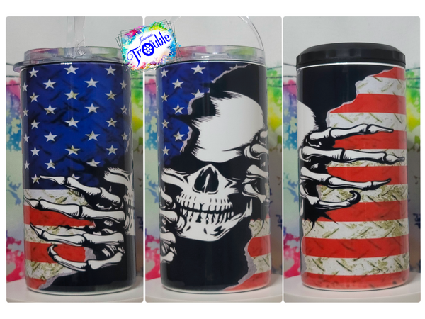 Take your thirst for adventure to the next level with our Skull Flag 4 in 1 Tumbler / Can Cooler! This 16 oz steel tumbler is vacuum insulated to keep your drinks at the perfect temperature for up to 12 hours. And with a rubber can cooler top, it's designed for ultimate versatility, fitting both regular and skinny cans or glass bottles. Don't settle for ordinary, embrace daring with our 4 in 1 tumbler!