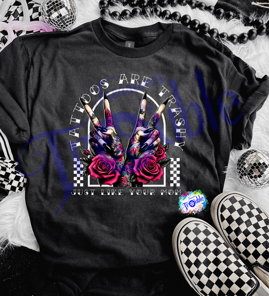 Introducing our 'Tattoos are Trashy Like Your Mom' cotton Gildan short sleeve t-shirt. This isn't just a t-shirt, it's a statement! Made from 100% pure cotton, it's as comfortable as it is bold. The high-quality DTF image is a conversation starter, guaranteed to turn heads and spark a few laughs. The design is edgy, daring, and a little bit cheeky, just like you. And the best part? It's available exclusively in the most versatile color - black. So, whether you're hitting the town or just lounging around, this t-shirt is your perfect companion. Remember, life's too short to wear boring clothes!
