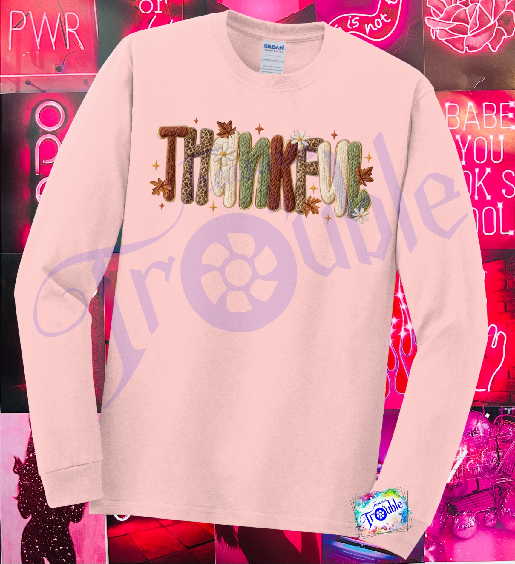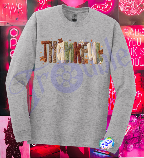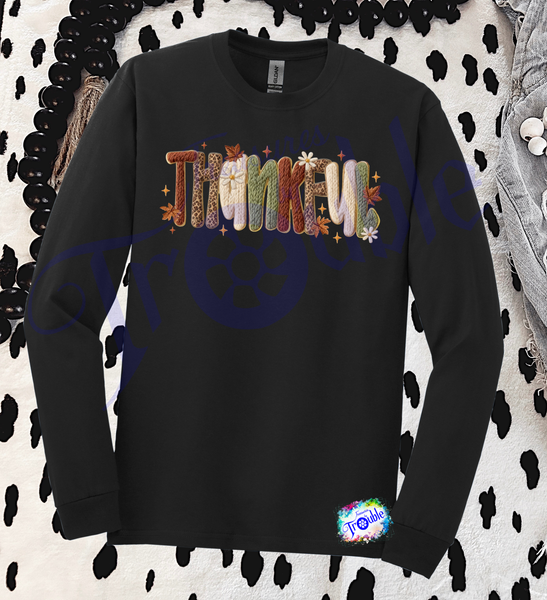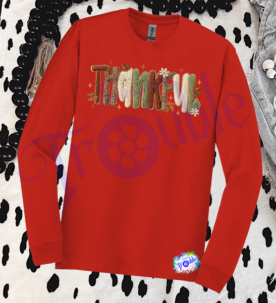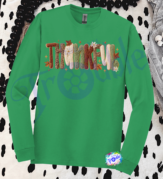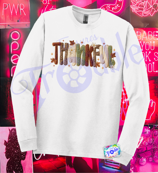 Show off your holiday spirit with our Thankful Faux Yarn Cotton Long Sleeve Tee! Made with soft and breathable Gildan cotton, this unisex shirt features a high-quality faux yarn DTF image. Perfect for Thanksgiving feasts and spreading cheer, this tee adds playful and stylish flair to your wardrobe.