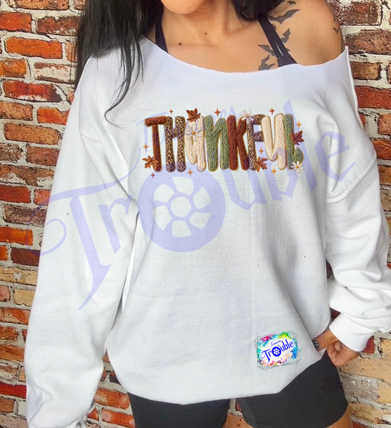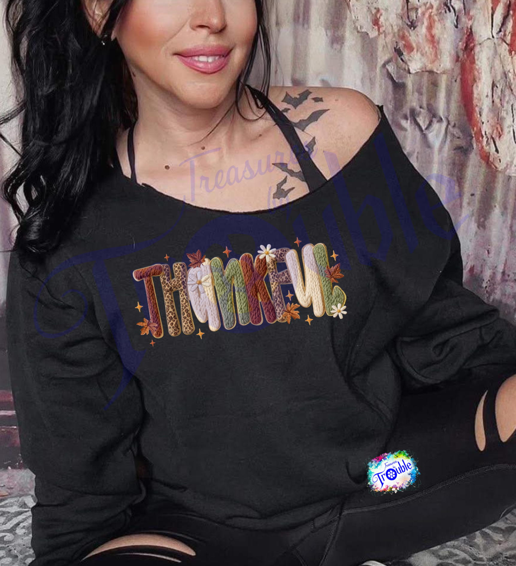 Get cozy and make a statement with our Thankful Faux Yarn Cotton Off Shoulder Sweatshirt. Made with soft, breathable Gildan cotton, this sweatshirt is perfect for expressing your unique style. The high-quality faux yarn DTF image and cut-out crewneck collar add a fun and cool touch to any outfit. Fall in love with this must-have piece!