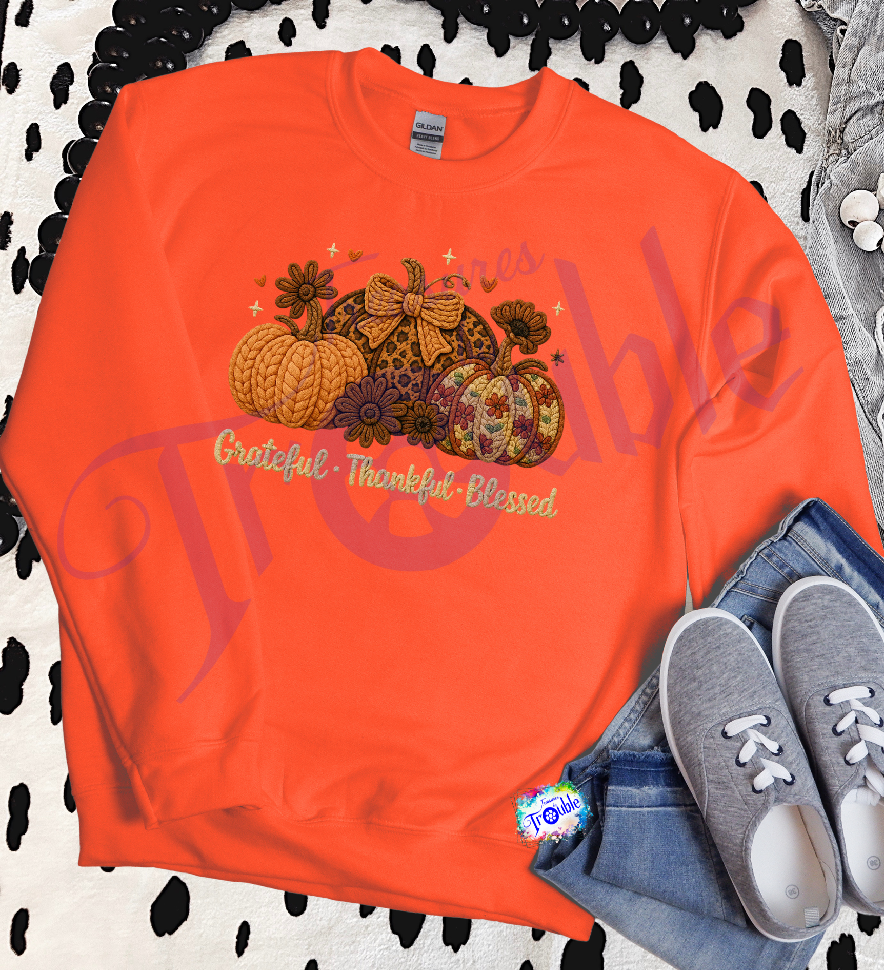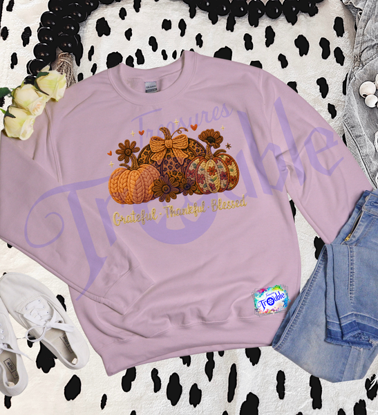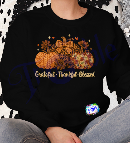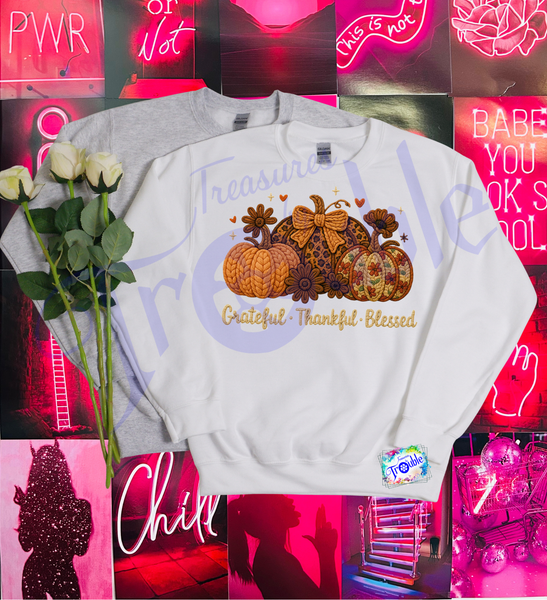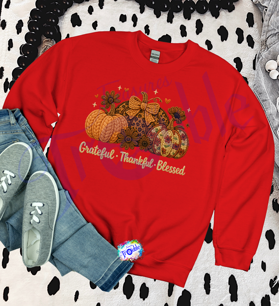 Introducing our cozy and stylish Thankful, Grateful, Blessed sweatshirt! Made with high-quality cotton and a vibrant faux yarn DTF image, making boring sweaters a thing of the past. Stand out this Thanksgiving and give thanks for fun fashion. Order yours now!